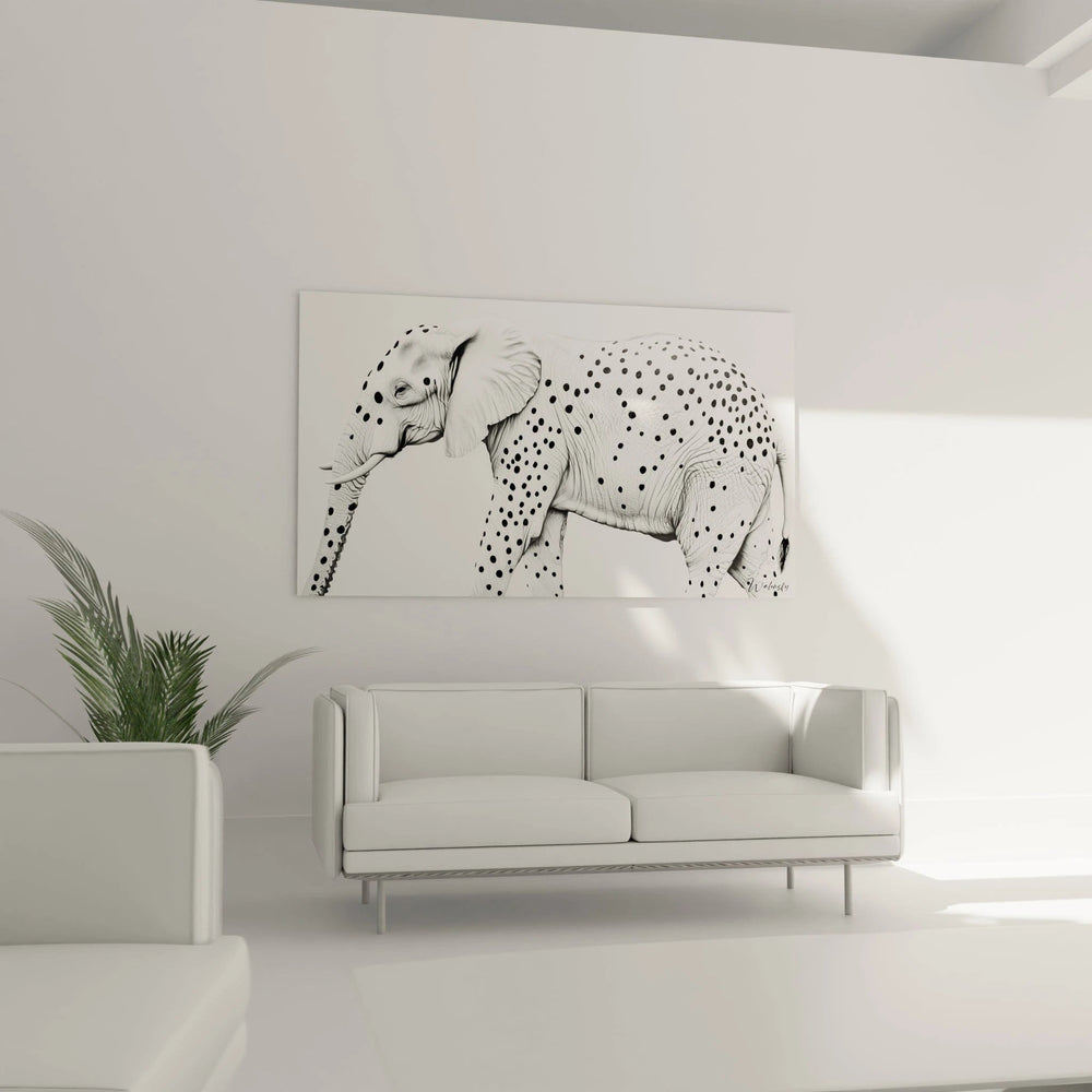 Ce tableau éléphant se distingue par son approche artistique innovante mêlant réalisme anatomique et stylisation contemporaine. L'œuvre présente un pachyderme majestueux dont la silhouette puissante occupe harmonieusement l'espace de la composition. Le tableau éléphant pointillé noir révèle immédiatement son caractère unique grâce à sa technique de motifs ponctuels qui transforment la peau lisse traditionnelle en surface texturée fascinante. Cette décoration murale éléphant moderne capte l'attention par son contraste saisissant entre les zones lisses et les zones densément ponctuées, créant un jeu visuel dynamique qui évoque à la fois la puissance animale et l'élégance graphique.