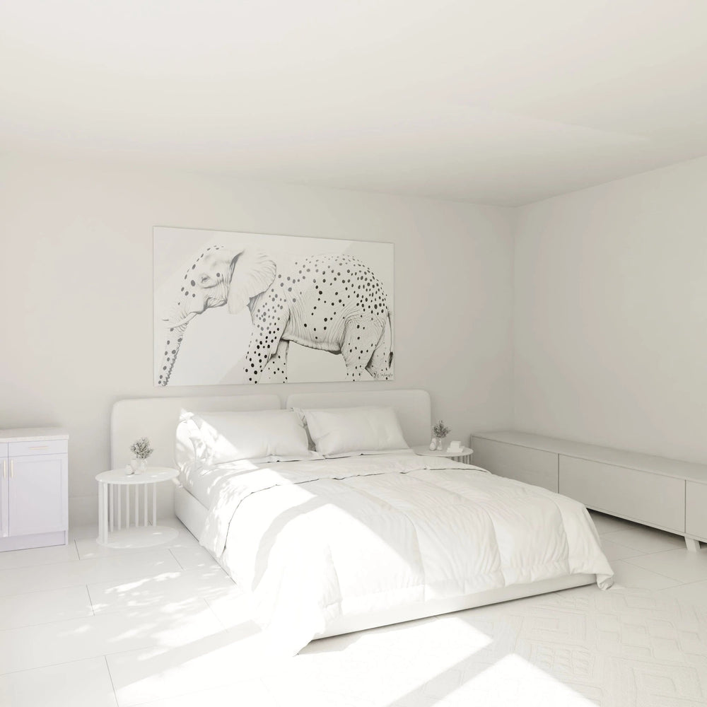 Cette art mural éléphant minimaliste tire sa force émotionnelle de cette restriction chromatique volontaire qui intensifie l'impact visuel et confère une intemporalité à l'œuvre.
