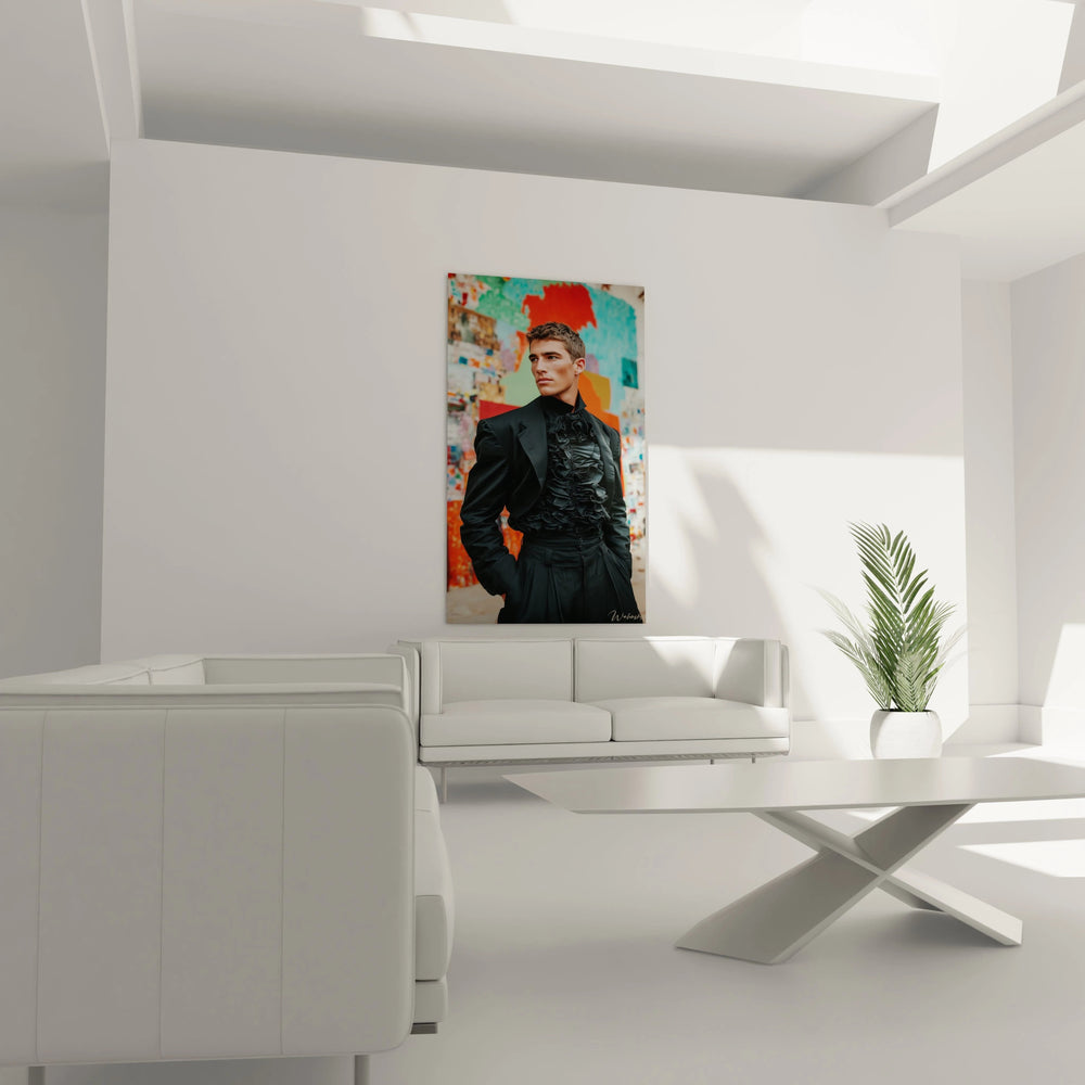 Tags : Portrait masculin élégant, Beauté masculine contemporaine, Art mural sophistiqué, Mode homme théâtrale, Contraste urbain classique
