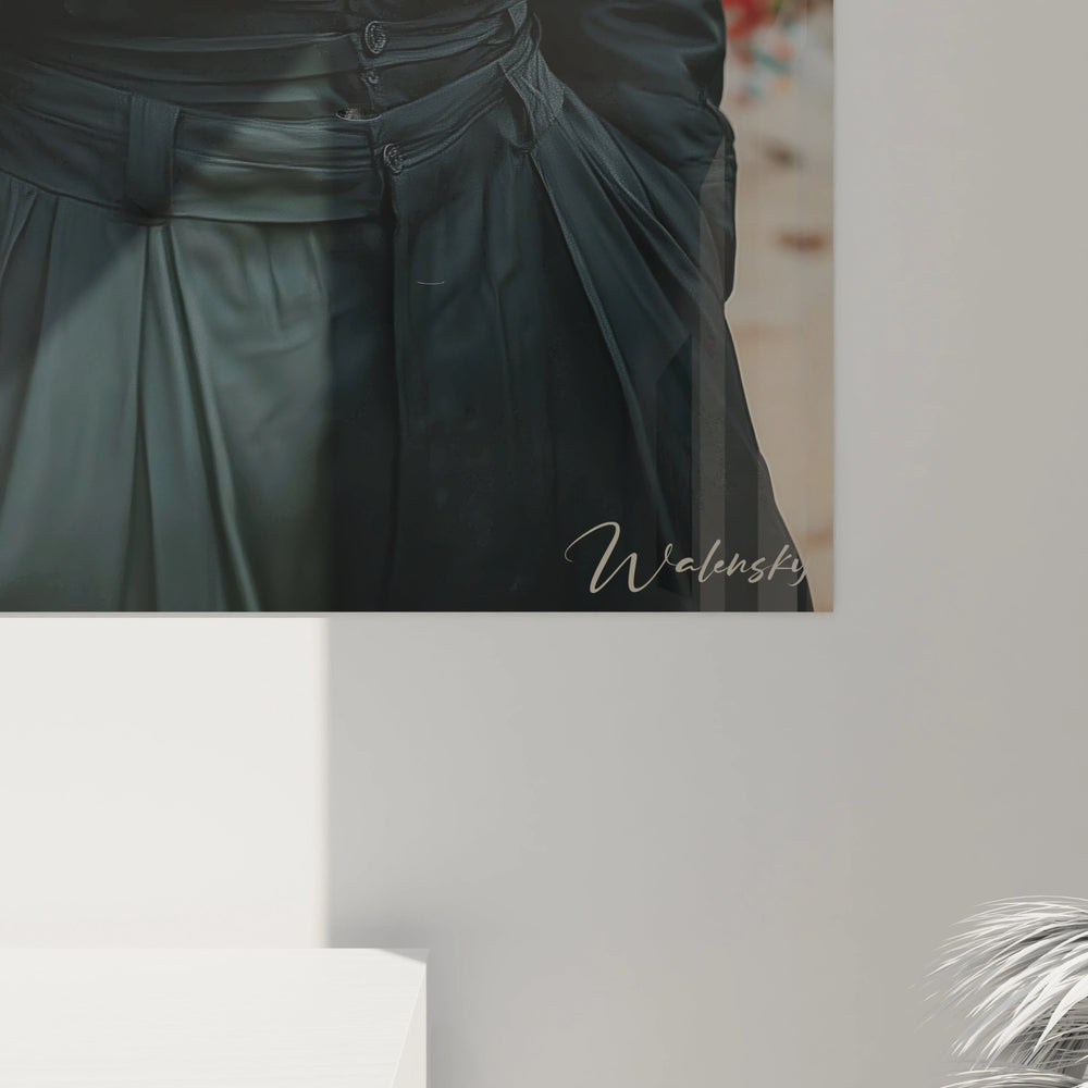 Ce tableau mural beauté masculine capture l'essence de la beauté masculine contemporaine à travers un portrait d'une intensité dramatique remarquable. L'œuvre présente un homme élégant aux traits sculptés, vêtu d'une tenue entièrement noire d'inspiration néo-romantique qui évoque l'élégance des dandys du XIXe siècle revisitée avec une sensibilité moderne. La pièce maîtresse de cette composition réside dans la chemise à plastron volumineux, où les plis et volants créent un ballet textile d'une sophistication extrême. Ces draperies sculpturales, minutieusement agencées, transforment le vêtement en véritable architecture textile masculine, conférant au personnage une prestance théâtrale saisissante.