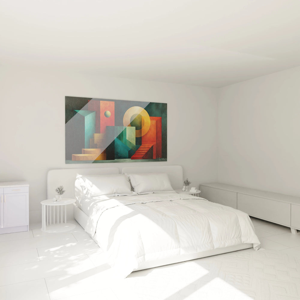 L'originalité réside dans la combinaison audacieuse d'éléments architecturaux et de formes pures dans un espace suspendu. L'escalier doré qui semble flotter défie les lois physiques tout en restant esthétiquement cohérent. La sphère dorée positionnée stratégiquement agit comme un point focal magnétique. Les transparences et superpositions créent des jeux optiques sophistiqués impossibles à reproduire par hasard. Cette art mural géométrie innovation se distingue par son approche architecturale de l'abstraction. Chaque forme possède sa propre identité tout en participant à l'harmonie générale, créant un tableau géométrie style architectural véritablement distinctif dans le paysage artistique contemporain.