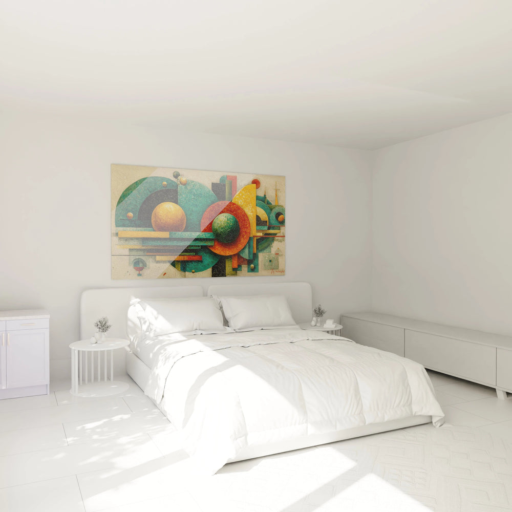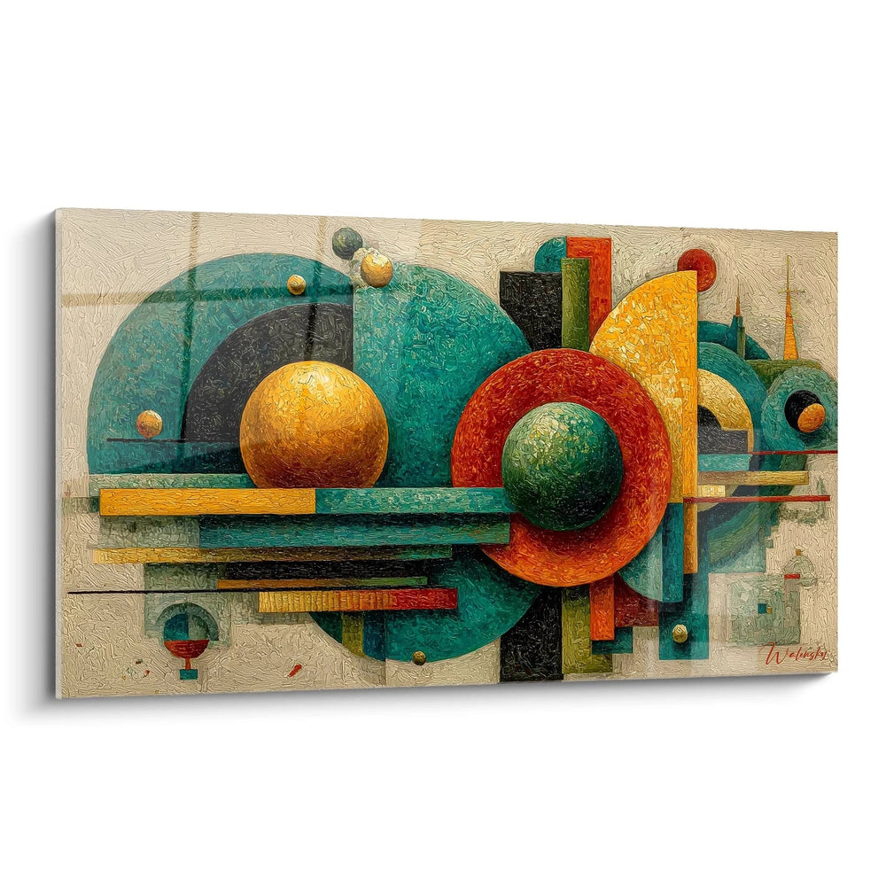 Cette œuvre géométrie abstraite moderne se distingue par plusieurs caractéristiques impossibles à reproduire. L'articulation particulière entre les grands arcs turquoise et les éléments rectangulaires orange crée une signature visuelle unique. La disposition asymétrique des sphères colorées suit une logique compositionnelle personnelle qui échappe aux règles académiques. Les rapports d'échelle entre les différents éléments révèlent une sensibilité artistique singulière. Cette décoration murale style constructiviste développe un langage plastique personnel où l'influence du Bauhaus se mêle à une approche contemporaine libre. La combinaison spécifique de rigueur géométrique et de liberté chromatique constitue la signature distinctive de cette création.