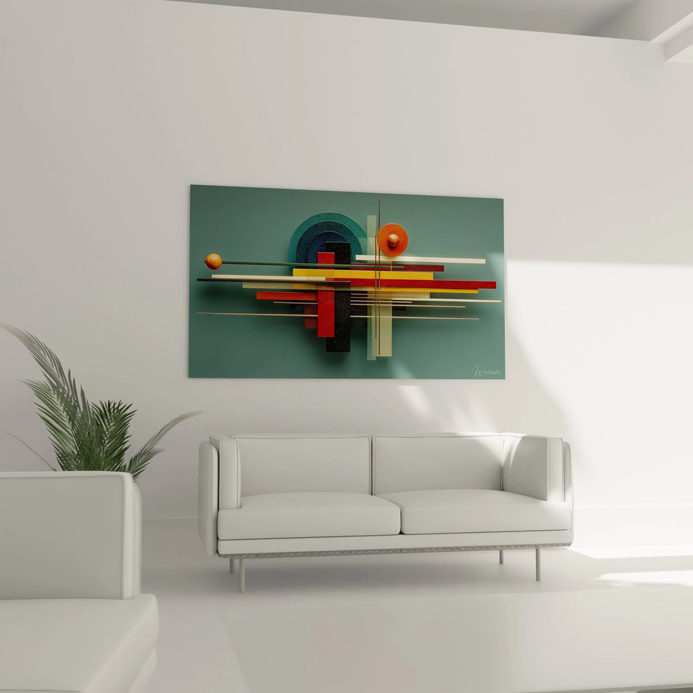 Cette œuvre se distingue par son approche innovante de l'espace géométrique où la bidimensionnalité traditionnelle laisse place à une illusion tridimensionnelle saisissante. Le tableau géométrie innovation révèle une signature artistique distinctive dans sa façon d'articuler les volumes dans l'espace. L'utilisation inhabituelle des cercles comme éléments de ponctuation dynamique transforme une composition qui pourrait être statique en un ensemble vibrant d'énergie. Cette décoration murale géométrie contemporaine propose une vision moderne de l'art constructiviste où la rigueur mathématique n'exclut pas la poésie visuelle. L'originalité réside dans cette capacité à créer du mouvement à partir de formes statiques, générant une œuvre géométrie dynamique d'une modernité saisissante.