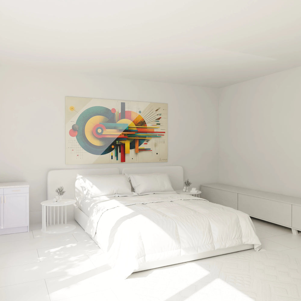La composition de ce tableau géométrique coloré s'organise autour d'un axe principal diagonal qui traverse l'œuvre de gauche à droite. Le système concentrique situé dans le tiers gauche agit comme ancrage visuel, tandis que les formes rectangulaires et linéaires créent une expansion horizontale dynamique. L'équilibre asymétrique génère une tension visuelle contrôlée, où chaque élément géométrique trouve sa place dans une hiérarchie spatiale précise. Les proportions respectent une logique mathématique tout en préservant une spontanéité artistique. Cette décoration murale abstraite utilise l'espace négatif de manière stratégique, permettant aux formes colorées de respirer et d'affirmer leur présence individuelle.