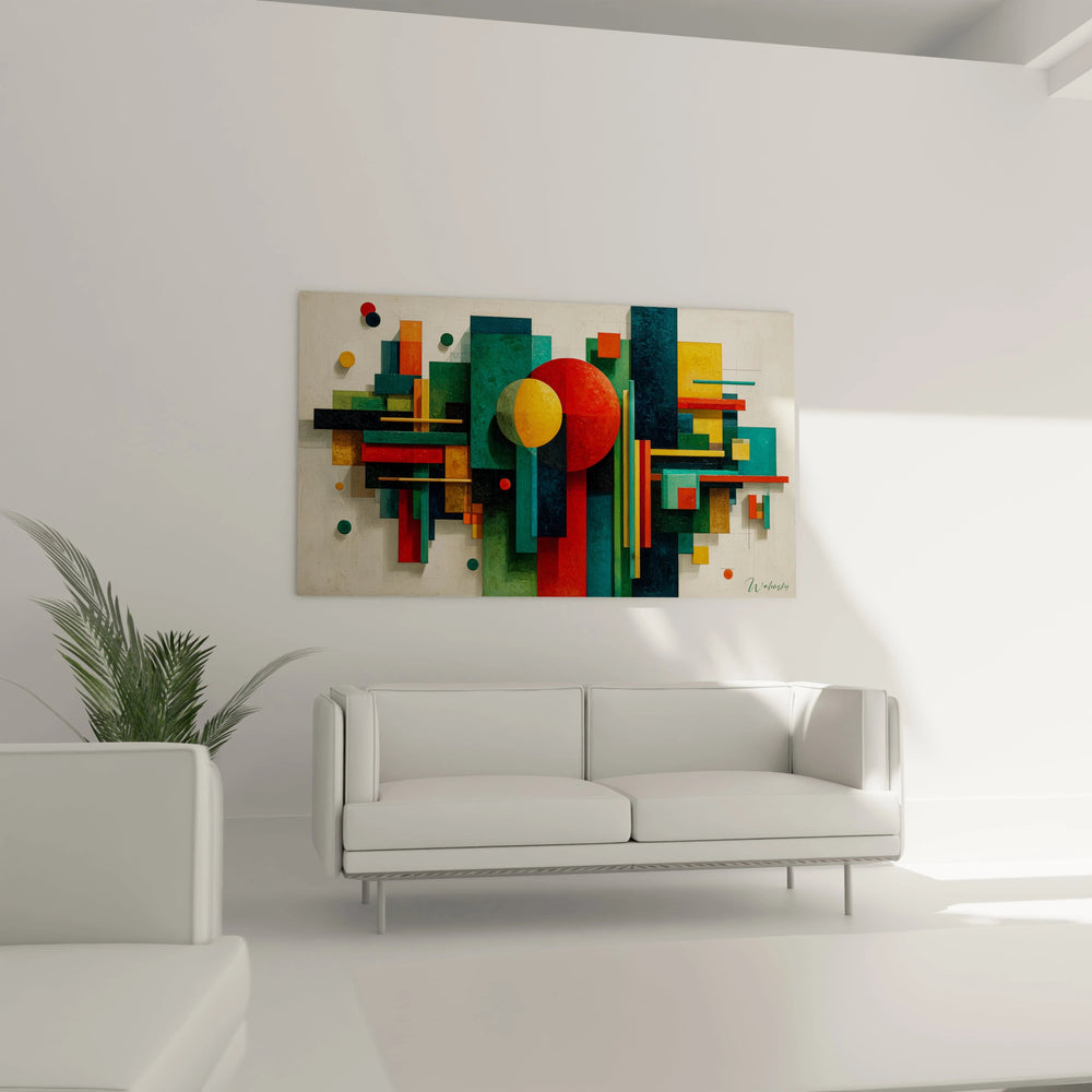 Ce tableau géométrique présente une composition abstraite remarquable où formes et couleurs s'organisent dans un équilibre parfait. L'œuvre révèle immédiatement sa nature constructiviste par l'agencement méticuleux de rectangles, cercles et formes géométriques pures. Le tableau géométrique abstrait coloré attire l'œil par son cercle rouge dominant, véritable point focal de la composition. Les éléments flottent dans un espace tridimensionnel créé par les ombres portées, donnant une profondeur sculptural à l'ensemble. Cette décoration murale géométrique moderne transcende la bidimensionnalité traditionnelle pour créer un véritable relief visuel.
