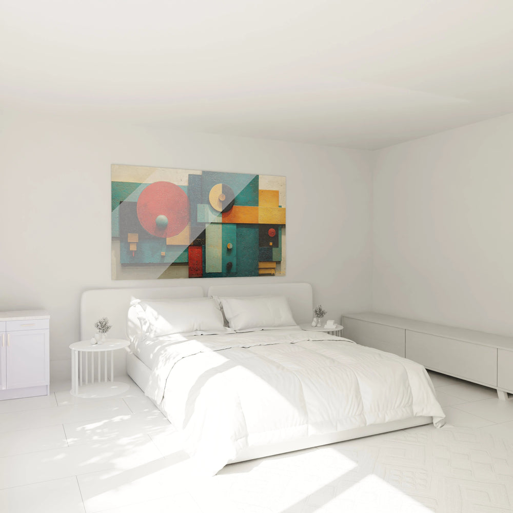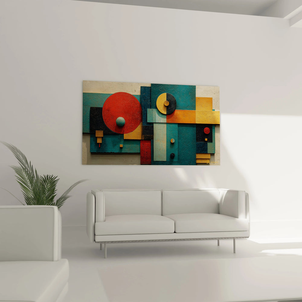 L'organisation spatiale de cette tableau géométrique formes superposées suit une logique de superposition et de chevauchement. Le grand cercle rouge occupe le tiers gauche de la composition, créant un point focal dominant. Les formes rectangulaires s'organisent en bandes horizontales et verticales, formant une grille sous-jacente. Cette art mural géométrique utilise l'asymétrie pour créer un équilibre dynamique. Les éléments de différentes tailles créent un rythme visuel qui guide le regard à travers l'œuvre, des grandes formes vers les détails plus fins.