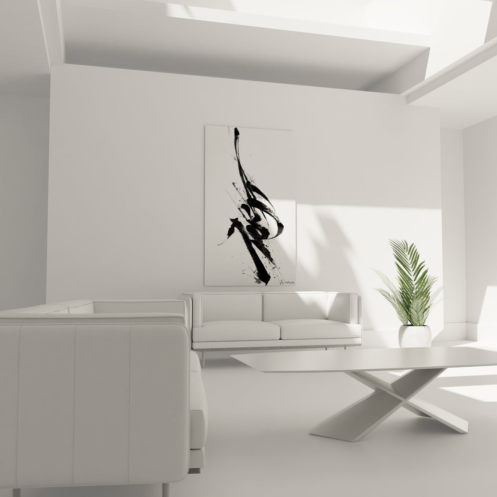 Ce tableau mural geste calligraphique présente une composition saisissante où l'encre noire s'épanouit sur un fond blanc immaculé dans un mouvement ascendant plein de vitalité. L'art abstrait moderne se révèle ici à travers des tracés spontanés et expressifs qui évoquent la gestuelle de la calligraphie orientale traditionnelle. Les éclaboussures d'encre et les traits fluides créent une dynamique visuelle captivante, transformant ce tableau décoratif contemporain en véritable méditation artistique. Cette œuvre d'art minimaliste capture l'essence même du mouvement créatif, où chaque goutte d'encre projetée raconte une histoire de spontanéité contrôlée. Le paysage abstrait noir et blanc se déploie dans une chorégraphie gestuelle qui transcende la simple représentation pour atteindre une dimension spirituelle profonde. L'artiste a su maîtriser l'art de l'équilibre entre chaos apparent et harmonie structurée, créant un tableau mural zen moderne qui apaise l'esprit tout en stimulant l'imagination. Les nuances de gris créées par la dilution naturelle de l'encre ajoutent une profondeur subtile à cette composition épurée, faisant de cette pièce un véritable art mural expressionniste contemporain adapté aux intérieurs sophistiqués.
