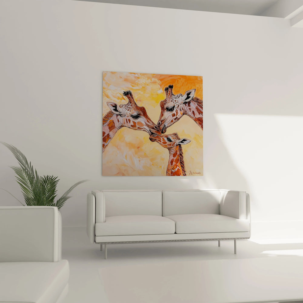 Ce tableau girafe révèle une scène familiale bouleversante où trois girafes partagent un moment d'intimité profonde. L'œuvre capture l'essence même de la tendresse animale à travers un tableau girafe famille aux tons chauds et vibrants. La composition dégage une émotion palpable grâce au contact délicat entre les museau des adultes et celui du girafon. Cette décoration murale girafe transforme instantanément l'espace par sa puissance émotionnelle et ses couleurs envoûtantes qui oscillent entre l'orange flamboyant et les ocres dorés.