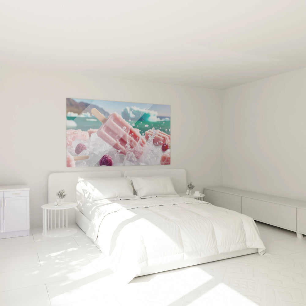 Cette œuvre d'art captivante présente un tableau glace aux fruits rouges dans un environnement aquatique saisissant. L'esquimau rose-rouge occupe le centre de la composition, créant un point focal immédiat qui attire le regard. Ce tableau glace rafraîchissante se distingue par son réalisme photographique et sa capacité à transmettre une sensation de fraîcheur instantanée. Les éclaboussures d'eau cristalline qui entourent la glace ajoutent un dynamisme remarquable à l'ensemble. L'arrière-plan flou révèle un paysage aquatique aux tons turquoise et bleu, évoquant un environnement estival idyllique. Cette décoration murale glace combine parfaitement l'aspect gourmand et l'esthétique rafraîchissante.