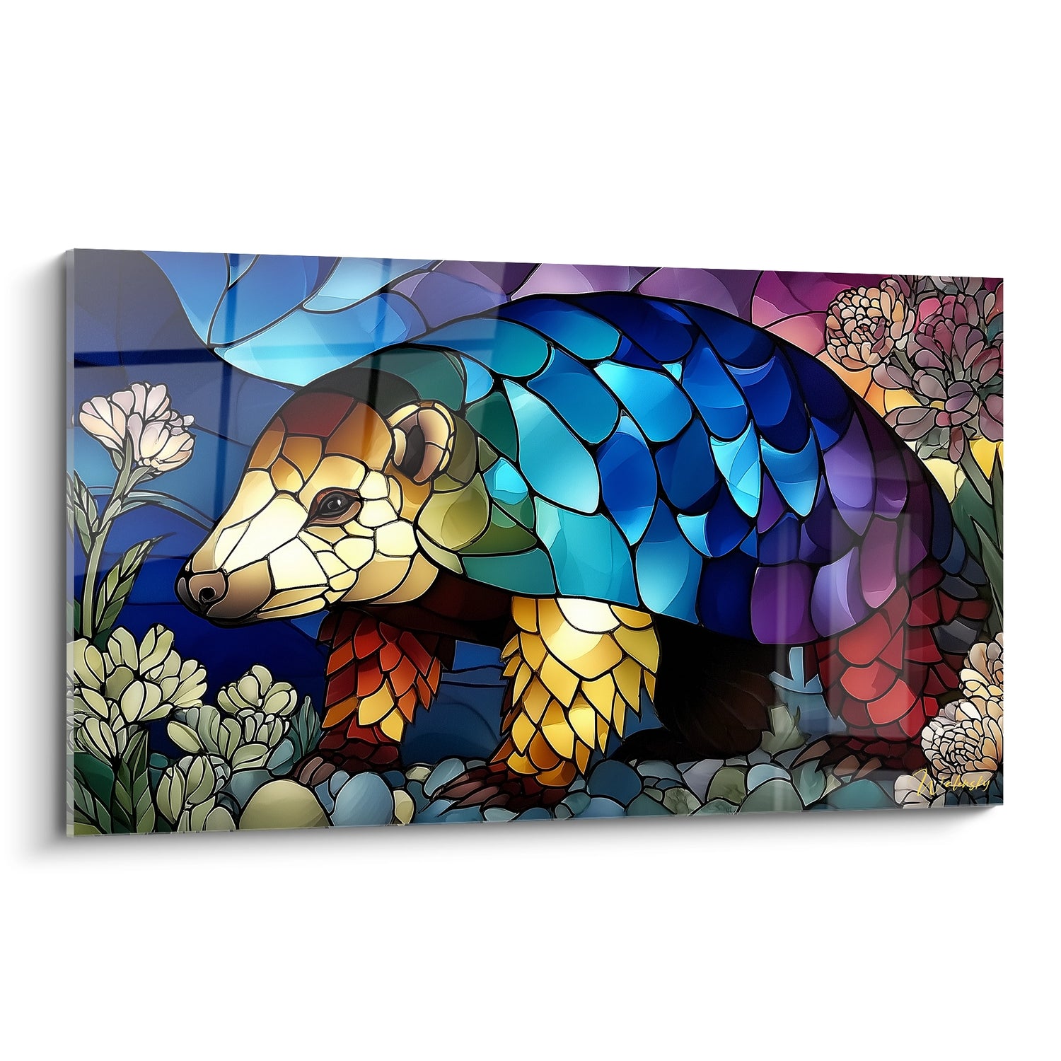Ce tableau mural pangolin présente une interprétation artistique saisissante de cet animal fascinant dans un style vitrail moderne. L'œuvre met en scène un pangolin aux écailles multicolores qui se déclinent dans une palette chromatique exceptionnelle, allant des bleus profonds aux violets chatoyants, en passant par des tons dorés et orangés. Chaque écaille est délicatement travaillée comme un fragment de verre coloré, créant un effet de mosaïque captivant. Le tableau décoratif Glyptodon révèle la morphologie unique de cet animal préhistorique, avec ses pattes robustes ornées d'écailles dorées et son museau allongé caractéristique. L'arrière-plan floral complète harmonieusement la composition avec des fleurs stylisées aux teintes pastel qui évoquent un jardin enchanté. Cette œuvre d'art animalière transforme le pangolin en véritable joyau artistique, où chaque détail anatomique devient prétexte à une explosion de couleurs. Le traitement en art vitrail contemporain sublime la texture naturelle des écailles de l'animal, créant un dialogue poétique entre nature et art décoratif. Ce tableau moderne pangolin s'inscrit parfaitement dans une démarche de sensibilisation à la beauté de la faune sauvage tout en proposant une approche esthétique raffinée et originale.