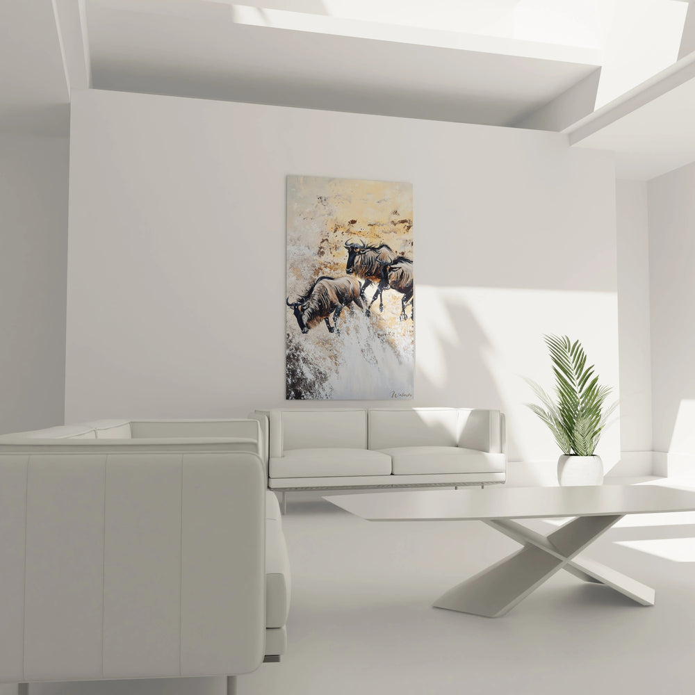 Ce tableau gnou capture un moment saisissant de la vie sauvage africaine avec une intensité remarquable. L'œuvre présente trois gnous en plein mouvement, leurs corps puissants projetés dans une course effrénée qui soulève des gerbes d'eau cristalline. Le tableau gnou safari dynamique révèle immédiatement sa force expressive à travers cette scène de migration naturelle. Les animaux semblent jaillir littéralement de la surface, créant une sensation de mouvement perpétuel qui caractérise cette décoration murale gnou exceptionnelle. L'artiste a su capter l'essence même de ces herbivores majestueux dans leur environnement naturel, transformant un instant fugace en une œuvre d'art permanente d'une beauté saisissante.