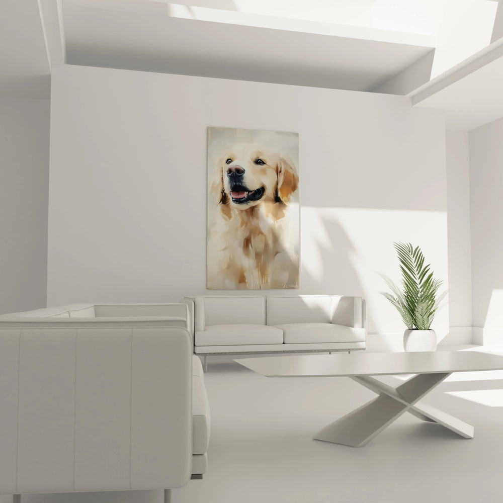 Chaque trait visible de ce tableau raconte l'histoire d’une amitié unique, celle du Golden Retriever, reconnu pour sa nature affectueuse et son âme joyeuse. La palette dorée, délicatement nuancée entre beige et blanc, amplifie cette sensation de confort enveloppant l’atmosphère. À travers ce regard lumineux et authentique, vous ressentirez cette connexion immédiate, comme si le chien veillait silencieusement sur votre bien-être quotidien.