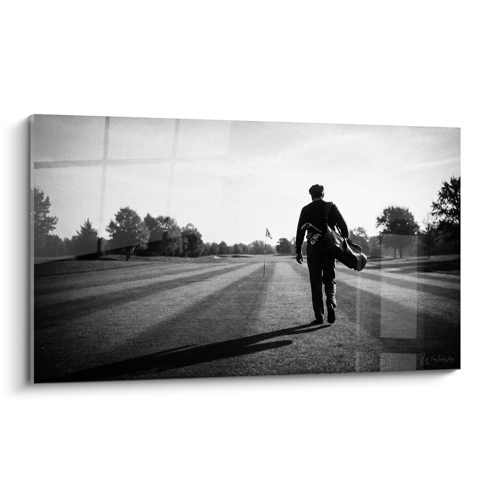 Cette œuvre d'art golf capture un moment contemplatif et inspirant : un golfeur solitaire marchant sur le fairway, son sac de golf à l'épaule, se dirigeant vers le prochain défi. La photographie en noir et blanc confère une dimension intemporelle à cette scène de golf, transformant un simple parcours en véritable théâtre d'émotions. Le contraste saisissant entre la silhouette du joueur et l'immensité du terrain de golf crée une composition visuelle puissante qui évoque la solitude méditative du golf. Les lignes de tonte parfaitement géométriques du green guident naturellement le regard vers le personnage central, symbole de persévérance et de passion golfique. Cette décoration golf murale s'intègre parfaitement dans tout intérieur dédié à ce sport noble, qu'il s'agisse d'un bureau, d'un salon ou d'un club house. L'atmosphère paisible et la beauté architecturale du parcours font de cette œuvre un hommage authentique à l'art de vivre golfique.