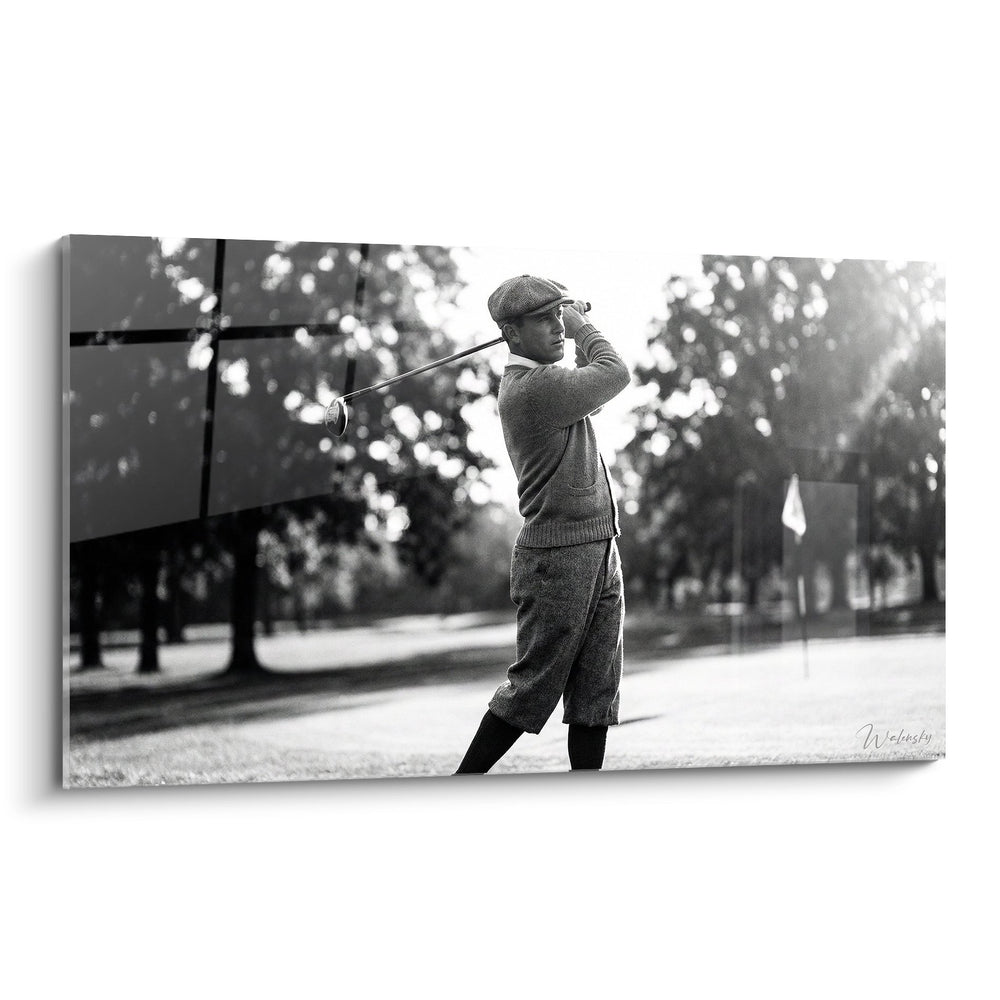 Cette œuvre d'art exceptionnelle capture l'essence du golf classique à travers une photographie vintage en noir et blanc d'un golfeur en plein swing. L'image révèle un joueur vêtu de l'équipement traditionnel des années passées : knickers en laine, pull-over élégant, casquette plate et chaussettes hautes. La posture parfaite du golfeur, figée au moment précis de l'élan, témoigne de la technique raffinée et de l'élégance qui caractérisaient le golf d'antan. Le décor champêtre en arrière-plan, avec ses arbres majestueux et sa lumière naturelle filtrée, crée une atmosphère nostalgique et intemporelle. Cette composition artistique transforme un simple moment sportif en véritable chef-d'œuvre décoratif, idéal pour les passionnés de golf et les amateurs d'art vintage. Le cadre moderne contraste subtilement avec le contenu historique, créant un équilibre parfait entre tradition et contemporanéité.