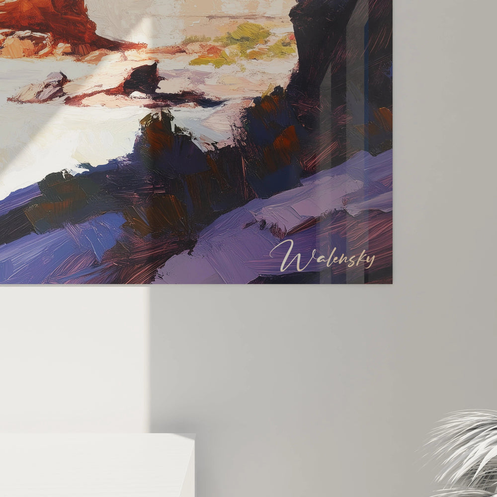 Cette œuvre est née d’une véritable aventure, d’une expédition dans des paysages grandioses où la lumière joue un rôle essentiel. Vous pouvez presque sentir la chaleur du soleil couchant enveloppant les falaises aux tons orangés, tandis que les ombres s’étirent dans les profondeurs mystérieuses du canyon. Le tableau capture cet instant fugace, cette danse entre roche ancestrale et eau vive, pour éveiller en vous un sentiment d’émerveillement mêlé de sérénité.