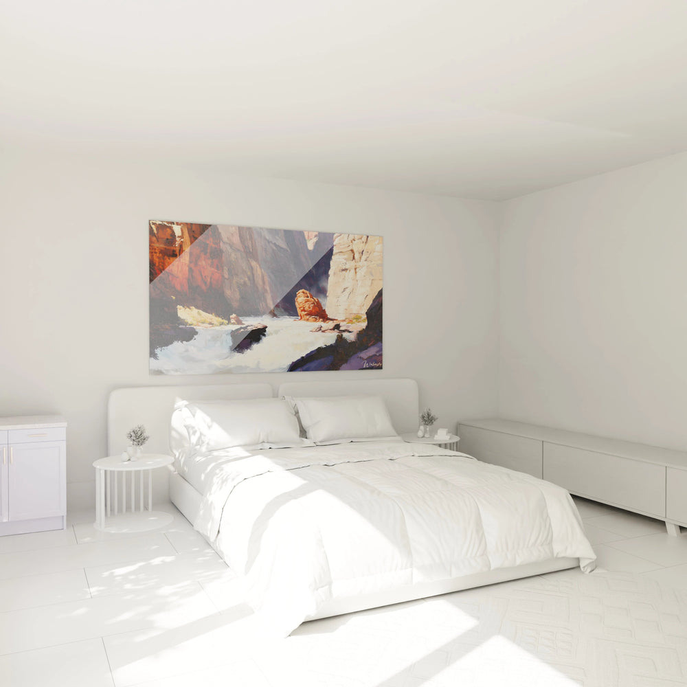 La composition de ce tableau canyon majestueux s'articule autour d'une perspective audacieuse qui guide le regard vers les profondeurs du défilé rocheux. Les falaises verticales encadrent puissamment la scène, créant un couloir naturel qui dirige l'œil vers le centre lumineux de l'œuvre où se rencontrent l'eau et la roche. Le premier plan est occupé par les rapides écumants, dont le mouvement contraste avec l'immobilité millénaire des parois environnantes. Les formations rocheuses imposantes sont disposées de manière à créer une tension visuelle qui équilibre parfaitement l'ensemble.