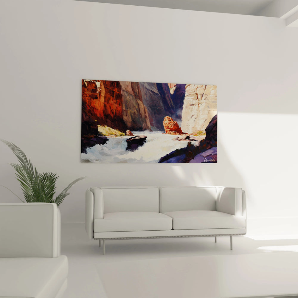 La palette chromatique de ce tableau canyon s'organise autour d'un dialogue saisissant entre teintes chaudes et froides. Les tons ocre, rouge et orangé des parois rocheuses dominent la composition et évoquent la chaleur réverbérée par la pierre sous le soleil. Ces couleurs terriennes contrastent magistralement avec le blanc éclatant des rapides tumultueux et les nuances de bleu profond des zones ombragées. Cette opposition chromatique dynamise l'ensemble et amplifie l'impact visuel de l'œuvre.