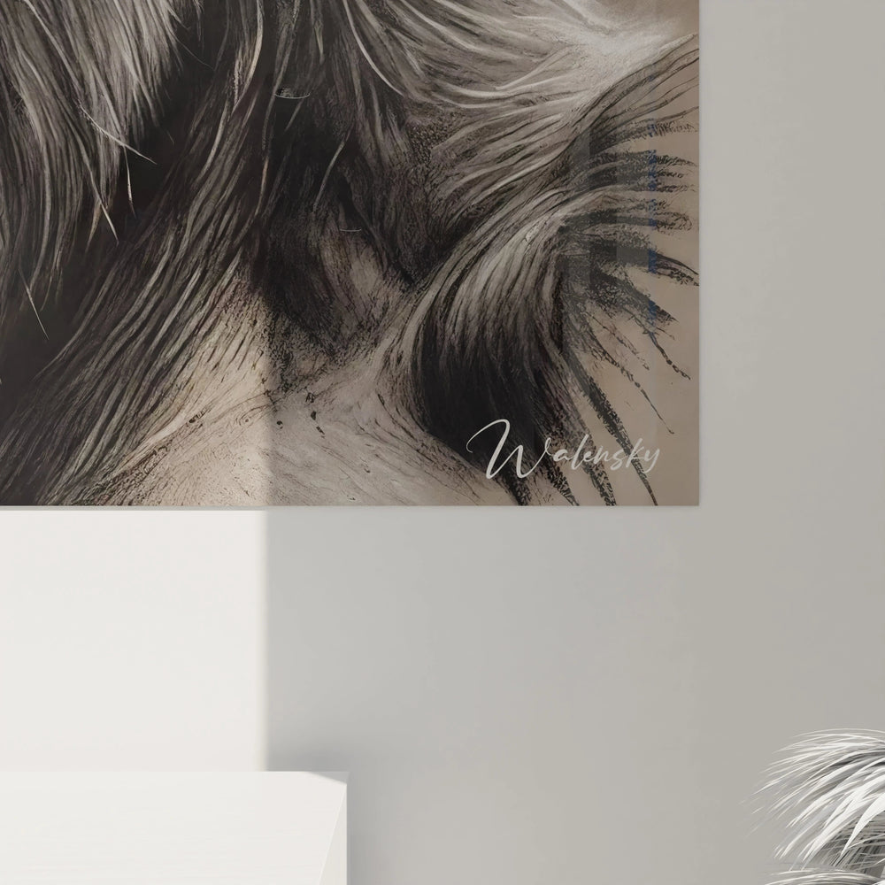 Chaque détail de ce tableau en noir et blanc a été pensé pour capturer la force douce et la noblesse silencieuse du gorille. Le contraste saisissant entre les ombres et la lumière met en valeur la texture délicate du pelage et révèle toute la complexité émotionnelle de l’animal. Ce jeu d’ombres dessine un portrait plein de mélancolie et d’introspection, qui vous invite à ralentir, à contempler et à ressentir une profonde connexion avec la nature.