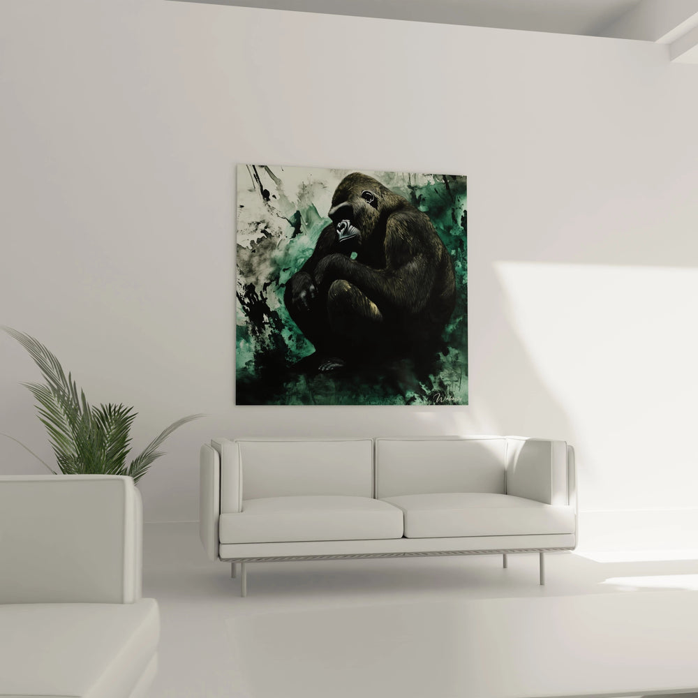 Ce tableau gorille décoratif s'épanouit particulièrement dans des environnements aux tonalités neutres qui n'entrent pas en concurrence avec sa palette colorée. Un mur blanc ou beige constitue l'écrin idéal pour révéler toute la subtilité de ses verts aquarellés. L'éclairage recommandé privilégie une source lumineuse indirecte qui évite les reflets tout en révélant les détails du pelage. Cette décoration murale gorille salon s'harmonise parfaitement avec des éléments décoratifs naturels : bois brut, plantes vertes, matériaux organiques. L'œuvre gagne en impact dans un espace dégagé où elle peut être contemplée à différentes distances, révélant progressivement sa richesse technique et émotionnelle.