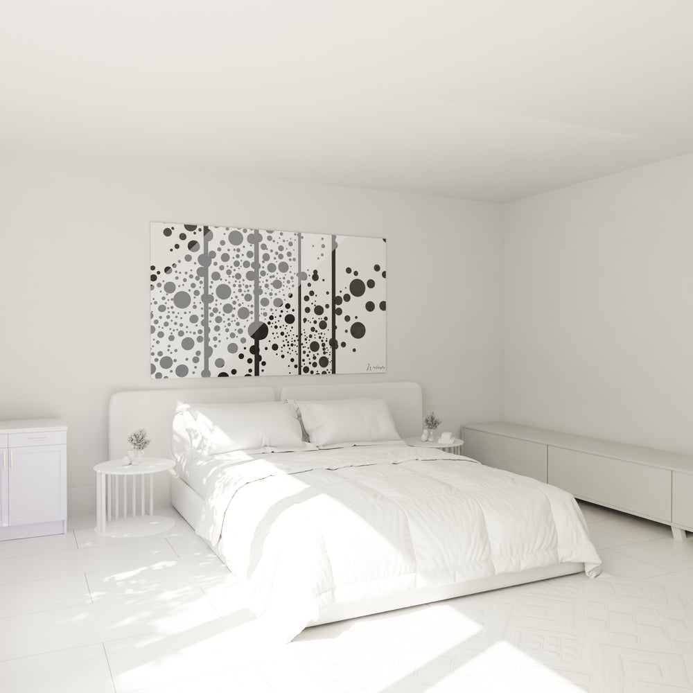 Cette œuvre explore exclusivement une palette monochrome d'une puissance remarquable, où le noir profond dialogue avec le blanc pur dans un contraste maximal. Les nuances de gris apparaissent subtilement dans certains points, créant des effets de transparence et de superposition qui enrichissent la lecture visuelle. Cette décoration murale monochrome tire sa force expressive de cette restriction chromatique volontaire, permettant aux formes de révéler leur essence géométrique pure.