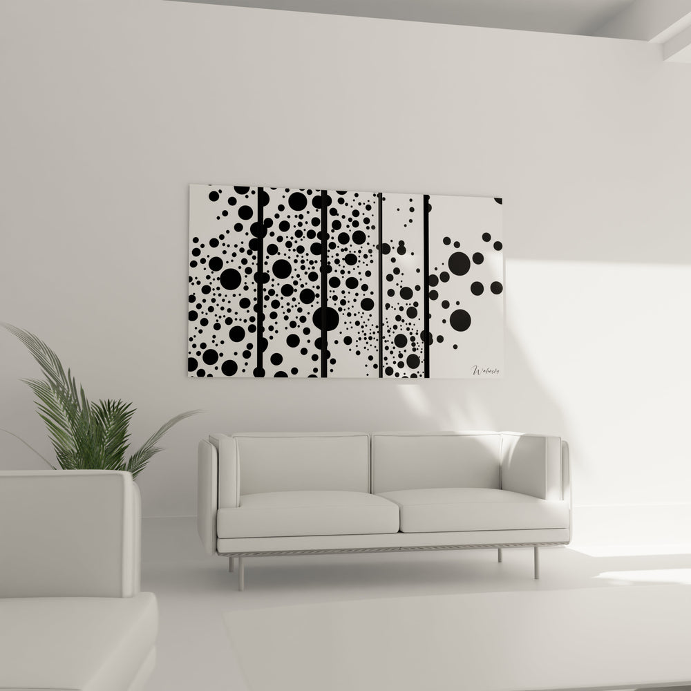 Ce tableau points abstraits se distingue par sa composition graphique minimaliste où des centaines de cercles noirs de tailles variées dansent sur un fond blanc immaculé. L'œuvre présente une répartition organique de formes géométriques pures, créant un rythme visuel hypnotique qui évoque simultanément une constellation nocturne et une pluie de particules suspendues dans l'espace. Cette décoration murale points géométriques révèle immédiatement son caractère contemporain par l'utilisation exclusive du contraste noir et blanc, technique qui amplifie l'impact visuel de chaque élément circulaire. Des lignes verticales noires structurent subtilement la composition, créant des colonnes invisibles qui organisent le chaos apparent des points dispersés.