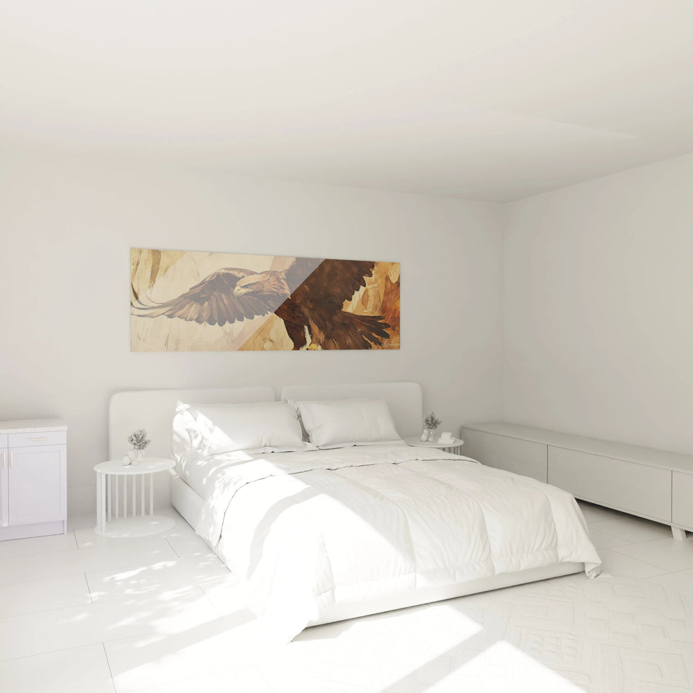 Ce tableau aigle présente une œuvre d'art saisissante qui capture l'essence même de la puissance aviaire. L'aigle royal, représenté dans un moment de vol majestueux, domine entièrement la composition avec ses ailes largement déployées. Cette décoration murale aigle se distingue par son réalisme expressif et sa capacité à transmettre une sensation de mouvement perpétuel. Les détails anatomiques de l'oiseau de proie sont rendus avec une précision remarquable, depuis les plumes individuelles jusqu'aux serres acérées. Ce tableau aigle en vol évoque immédiatement un sentiment de liberté absolue et de noblesse sauvage, transportant l'observateur dans les hauteurs montagneuses où règnent ces maîtres du ciel.