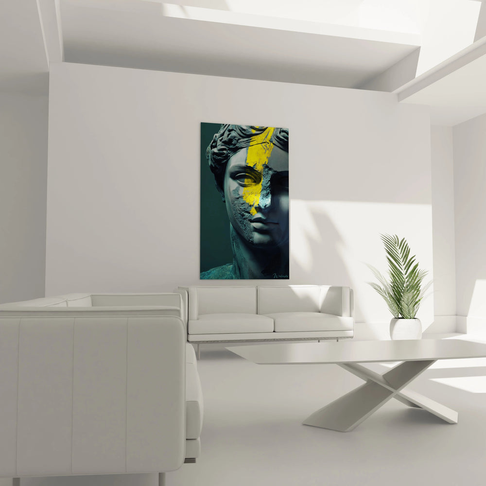 Cette harmonie chromatique du tableau statue grecque joue sur la confrontation entre la froideur des teintes bleu-vert et la chaleur vibrante du jaune. Ce contraste crée un impact émotionnel puissant qui transcende l'aspect purement décoratif pour suggérer une réinterprétation contemporaine de l'héritage classique.
