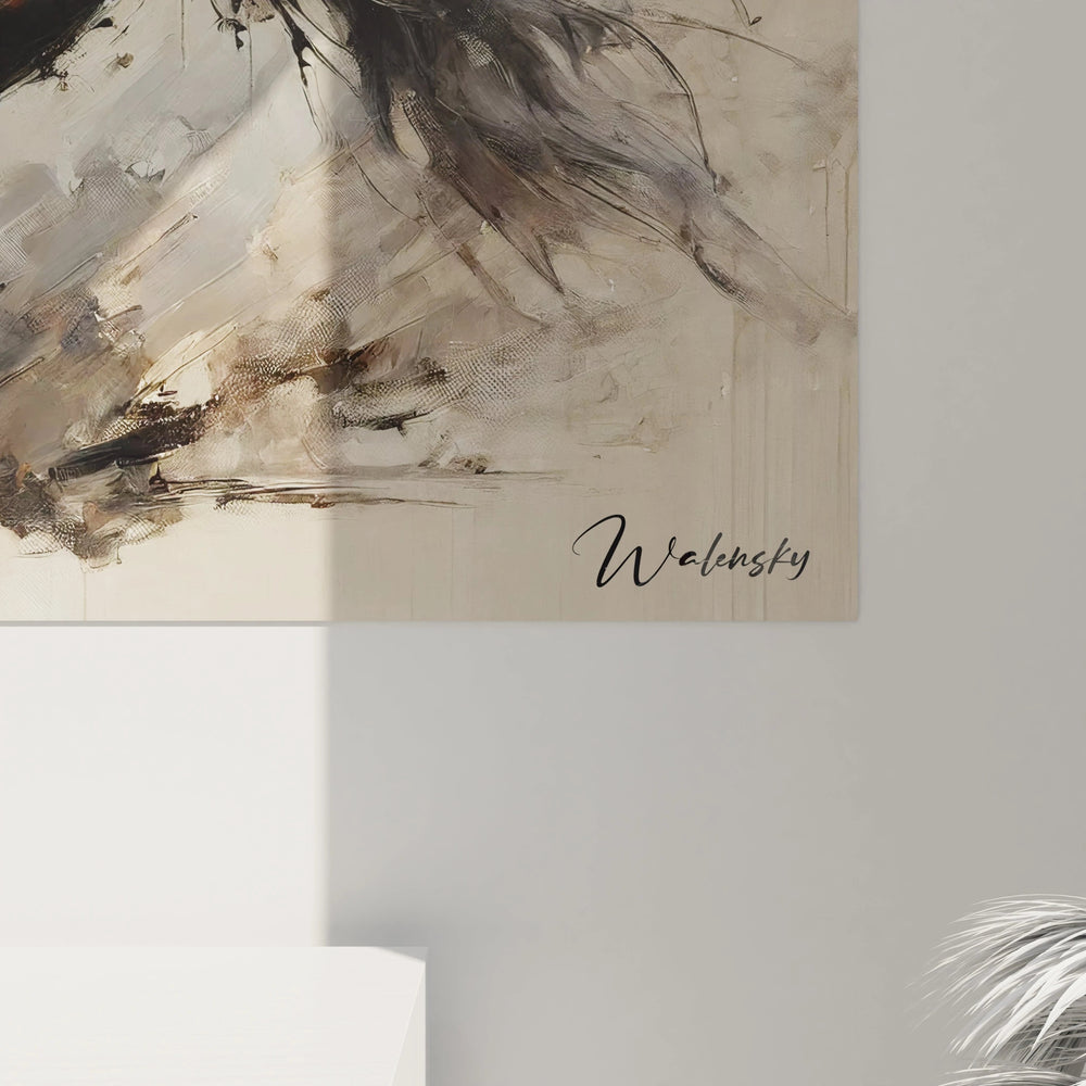 Le Tableau Grâce du Galop s’adapte parfaitement aux murs aux teintes neutres ou texturés, où ses couleurs naturelles resplendissent, nourries par une lumière chaude qui accentue la profondeur et le relief des coups de pinceau.