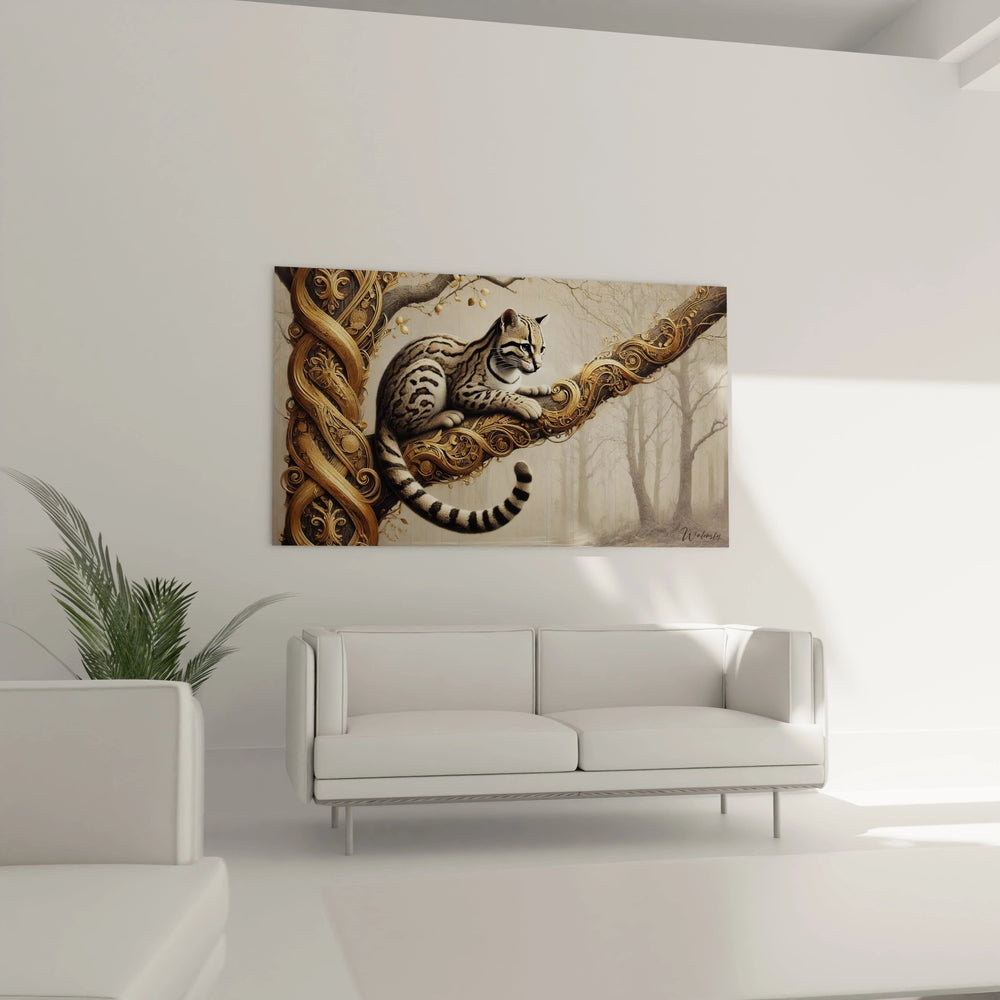 Chaque détail de ce tableau a été imaginé pour vous transporter. Les arabesques dorées semblent danser autour de l’ocelot, évoquant une élégance intemporelle et une force discrète. Ces ornements délicats capturent la grâce naturelle de ce félin rare, tout en insufflant une aura mystique à votre espace. Le contraste subtil entre les tons bleus et gris crée une atmosphère à la fois apaisante et sophistiquée, idéale pour un intérieur raffiné.