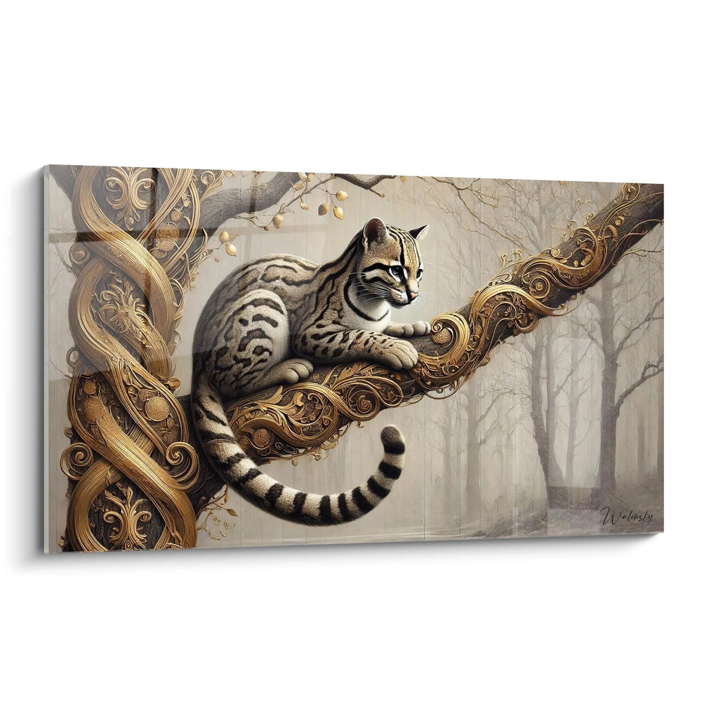Imaginez un instant la présence élégante d’un ocelot mystérieux, capturée dans un éclat doré sublimé par des touches de bleu profond et gris apaisant. Ce tableau unique est bien plus qu'une simple œuvre d'art : c'est une invitation à plonger au cœur d’un univers où la nature sauvage dialogue avec un rythme presque céleste, suspendu dans le temps.
