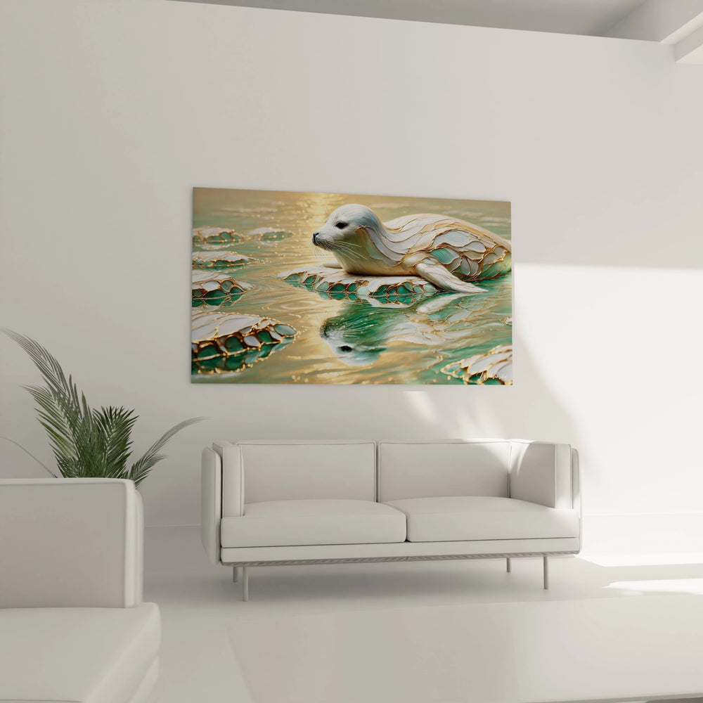 Au cœur de ce tableau, le phoque, symbole de tranquillité et de vie fluide, repose paisiblement sur une plaque de glace. Les lignes délicates et les nuances profondes, allant du blanc immaculé aux reflets dorés en passant par les teintes vertes de l’eau, créent une sensation de calme enveloppant. Chaque regard porté sur cette composition vous invite à ressentir la brise marine, la fraîcheur de l’océan et la chaleur subtile d’un soleil couchant.