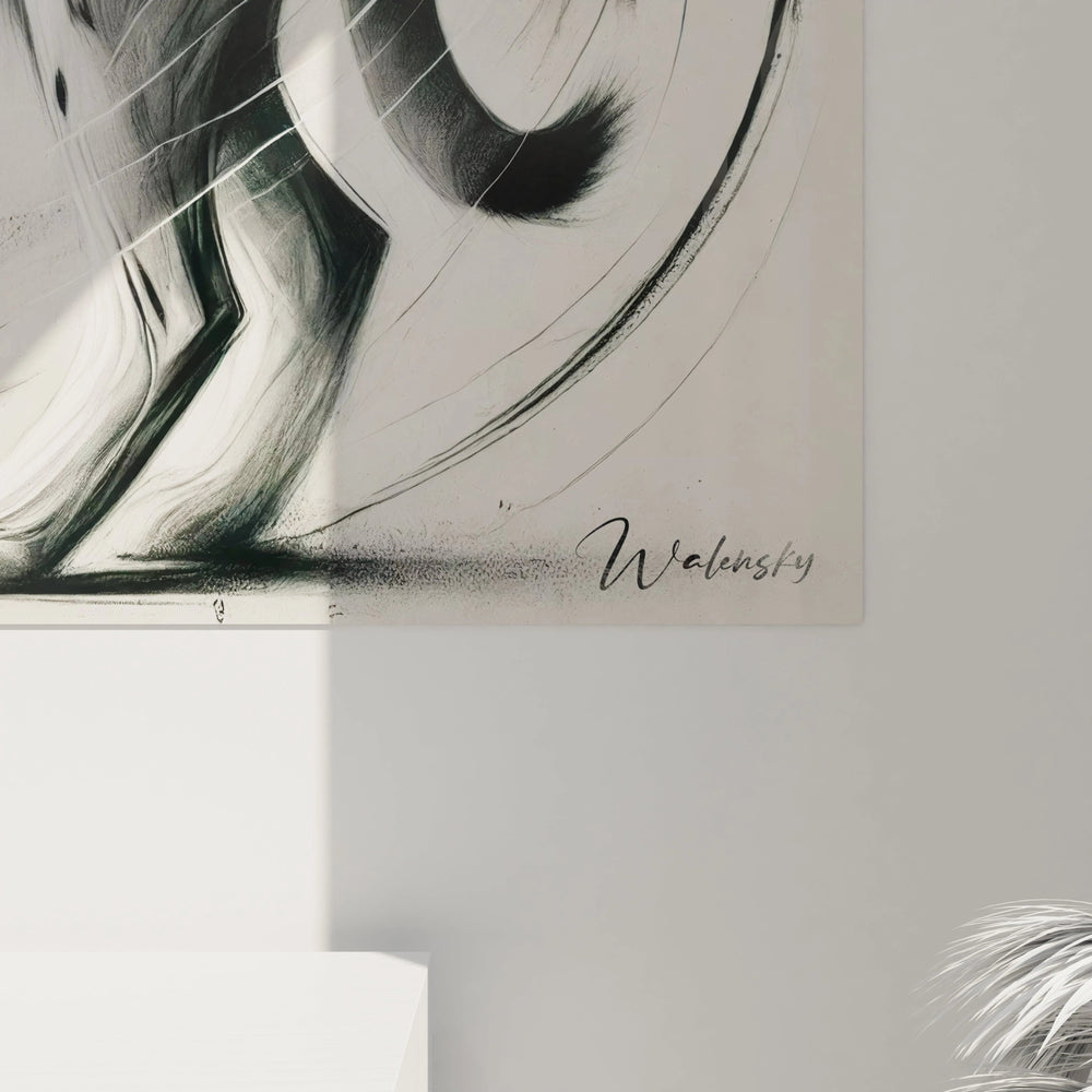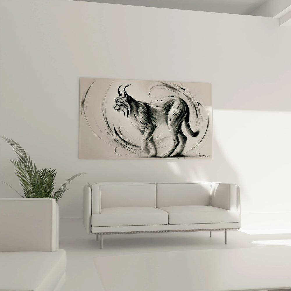 Évoquant un subtil équilibre entre réalisme et abstraction, ce tableau joue magistralement sur les contrastes. Le pelage du lynx dévoile un luxe de détails tandis que les lignes dynamiques environnantes créent une sensation de légèreté et de flottement. La palette de noir, blanc et gris instaure une atmosphère à la fois sophistiquée et intemporelle, parfaite pour magnifier tout intérieur contemporain.