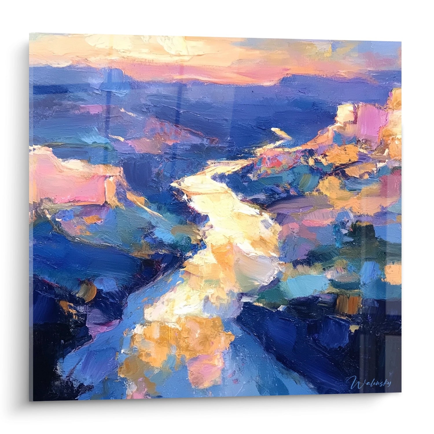Ce tableau mural Grand Canyon capture la majesté légendaire des formations rocheuses américaines baignées dans les lumières dorées du crépuscule. L'artiste Walensky a magistralement représenté les strates géologiques colorées qui caractérisent ces gorges spectaculaires, utilisant une technique de peinture impressionniste qui fait vibrer chaque nuance. Les canyons profonds se dessinent en camaïeu de bleus intenses, contrastant harmonieusement avec les parois rocheuses illuminées d'orange et de rose. Cette œuvre d'art paysage canyon révèle la profondeur vertigineuse de ces formations naturelles millénaires, où chaque coup de pinceau évoque l'érosion patiente du temps. Les reflets lumineux sur les parois rocheuses créent un jeu d'ombres et de lumières qui guide le regard vers l'horizon lointain. Ce tableau décoratif gorges naturelles transforme l'espace en fenêtre ouverte sur l'un des plus beaux spectacles géologiques de la planète, offrant une décoration murale nature sauvage d'exception.