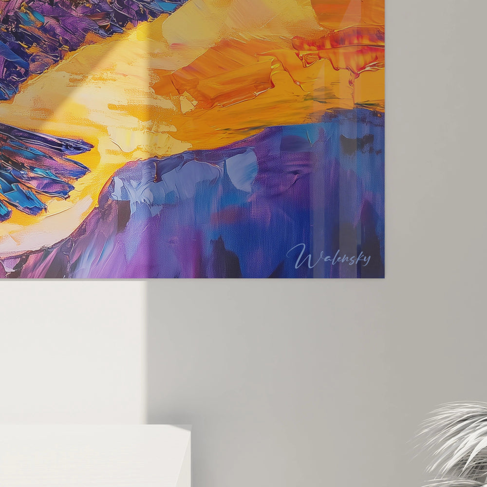 Chaque détail de ce tableau a été pensé pour éveiller vos sens : les nuances profondes de magenta évoquent la majesté des sommets alpins baignés dans la lumière du crépuscule, tandis que la silhouette imposante de l’aigle symbolise la liberté et la puissance, enveloppant votre pièce d’une aura contemplative.