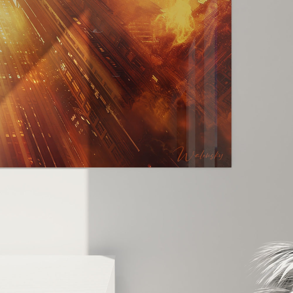 Ce tableau mural New York capture l'essence majestueuse de Manhattan dans une perspective spectaculaire vue du sol. L'œuvre présente des gratte-ciel illuminés qui s'élancent vers le ciel dans une composition verticale saisissante. La lumière dorée urbaine baigne toute la scène, créant une atmosphère chaleureuse et enveloppante qui contraste avec la froideur habituelle de l'architecture métropolitaine. Les façades des buildings reflètent cette luminosité exceptionnelle, révélant les détails architecturaux et les fenêtres éclairées qui témoignent de la vie urbaine intense. Cette décoration murale moderne transforme l'iconique skyline new-yorkais en une vision presque mystique, où les rayons lumineux semblent émaner du cœur même de la ville. L'art urbain contemporain trouve ici une expression parfaite, mêlant réalisme architectural et romantisation de l'environnement urbain. La technique picturale utilisée amplifie l'effet dramatique de cette ambiance metropolitaine dorée, faisant de chaque gratte-ciel un pilier de lumière dans cette cathédrale urbaine. Ce tableau décoratif Manhattan évoque la grandeur et l'énergie de la ville qui ne dort jamais, capturant un moment où la nature et l'architecture semblent fusionner dans une harmonie dorée.