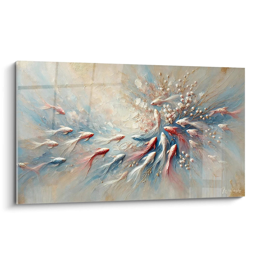 Voici une œuvre qui transforme votre espace en un sanctuaire de calme et de pureté. Les poissons, figurés dans des teintes subtiles de blanc, rouge et rose, évoquent la beauté fragile et éphémère d’un moment suspendu. Chaque trait, chaque mouvement sur la toile vous transporte vers un univers où la légèreté règne en maître, apaisant vos sens et invitant à la contemplation.