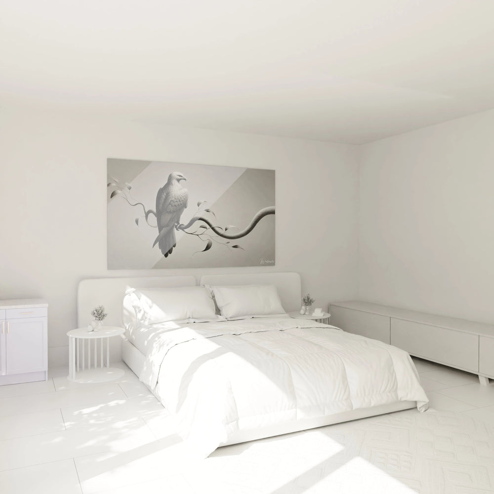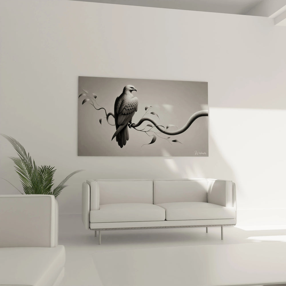 Ce tableau révèle une interprétation monochrome raffinée où les nuances subtiles de noir, blanc et gris s’entrelacent pour offrir une texture délicate, presque tactile. Chaque détail, du plumage finement gravé à la courbe harmonieuse de la branche suspendue, est une invitation à la contemplation. Vous ressentez presque la douceur de ce moment suspendu dans le temps, où l’aigle règne en maître silencieux, symbole d'une sagesse profonde et d'une liberté farouche.