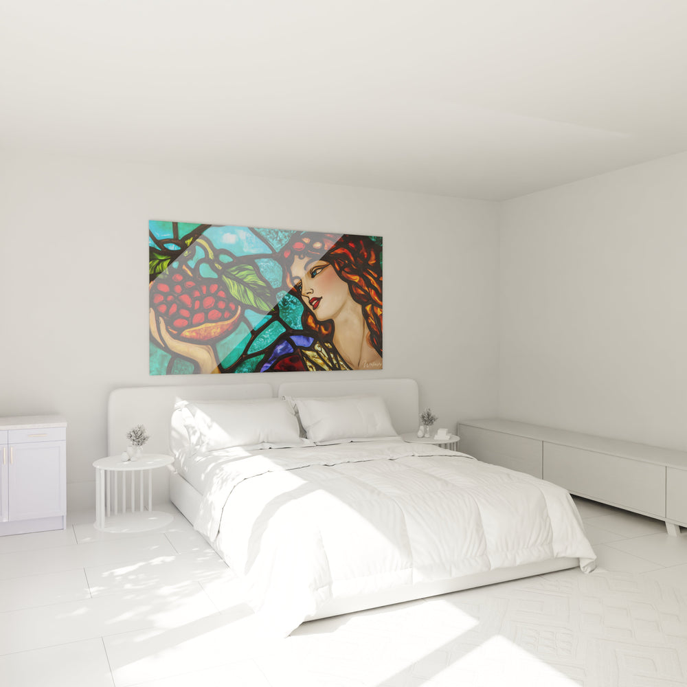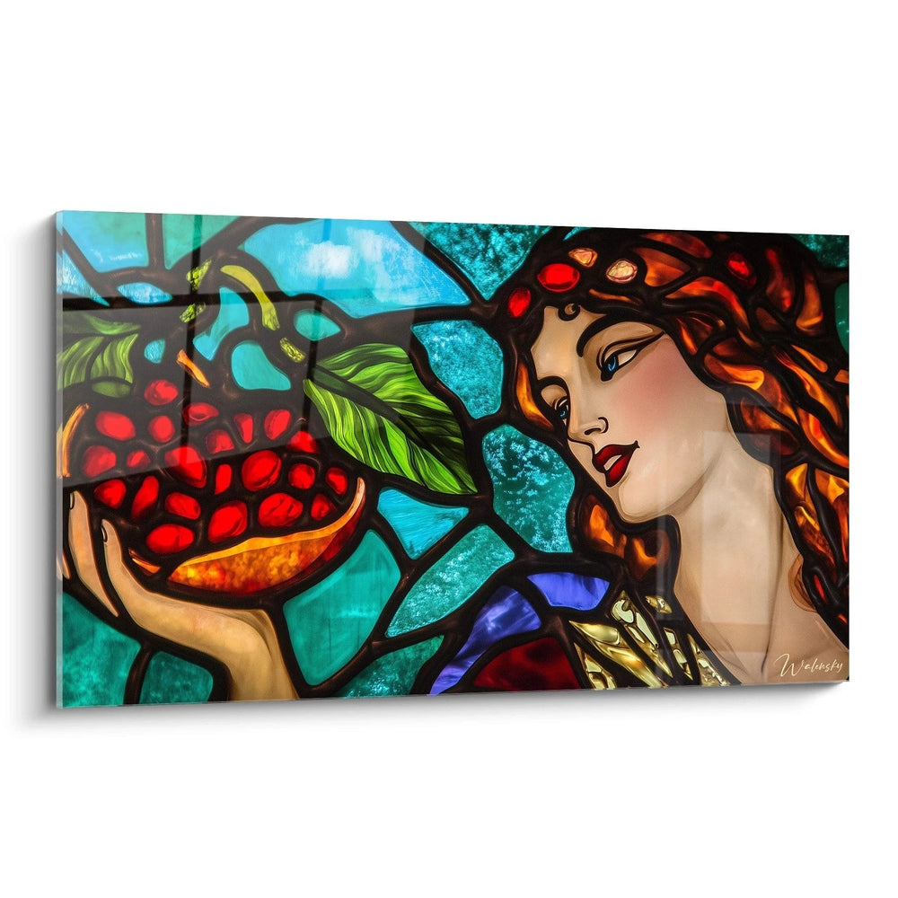 Ce tableau vitraux femme mythologique captive immédiatement par sa luminosité exceptionnelle et ses couleurs éclatantes. La figure féminine au centre, avec ses cheveux auburn flamboyants et son teint porcelaine, tient délicatement une grenade rouge vif symbolisant l'abondance. Les segments colorés typiques du vitrail créent une mosaïque lumineuse où chaque pièce est délimitée par des lignes noires évoquant le plomb traditionnel. La composition harmonieuse marie des formes organiques et géométriques avec une élégance rappelant l'Art Nouveau.