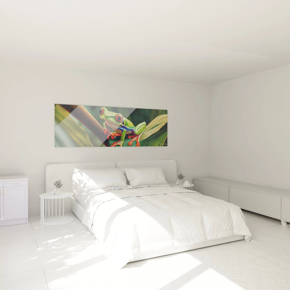 Cette art mural grenouille se distingue par plusieurs éléments visuels exceptionnels qui en font une œuvre unique. Les yeux rouge carmin hypnotiques constituent l'élément le plus frappant, créant une connexion émotionnelle immédiate avec l'observateur. La précision anatomique de l'animal, notamment dans le rendu des orteils palmés et de la texture cutanée, révèle un souci du détail remarquable. L'intégration harmonieuse de l'animal dans son environnement bambou crée une scène naturelle parfaitement équilibrée. Cette tableau grenouille art contemporain transcende la simple représentation animalière pour devenir une véritable célébration de la beauté naturelle tropicale, impossible à reproduire avec une telle intensité émotionnelle.