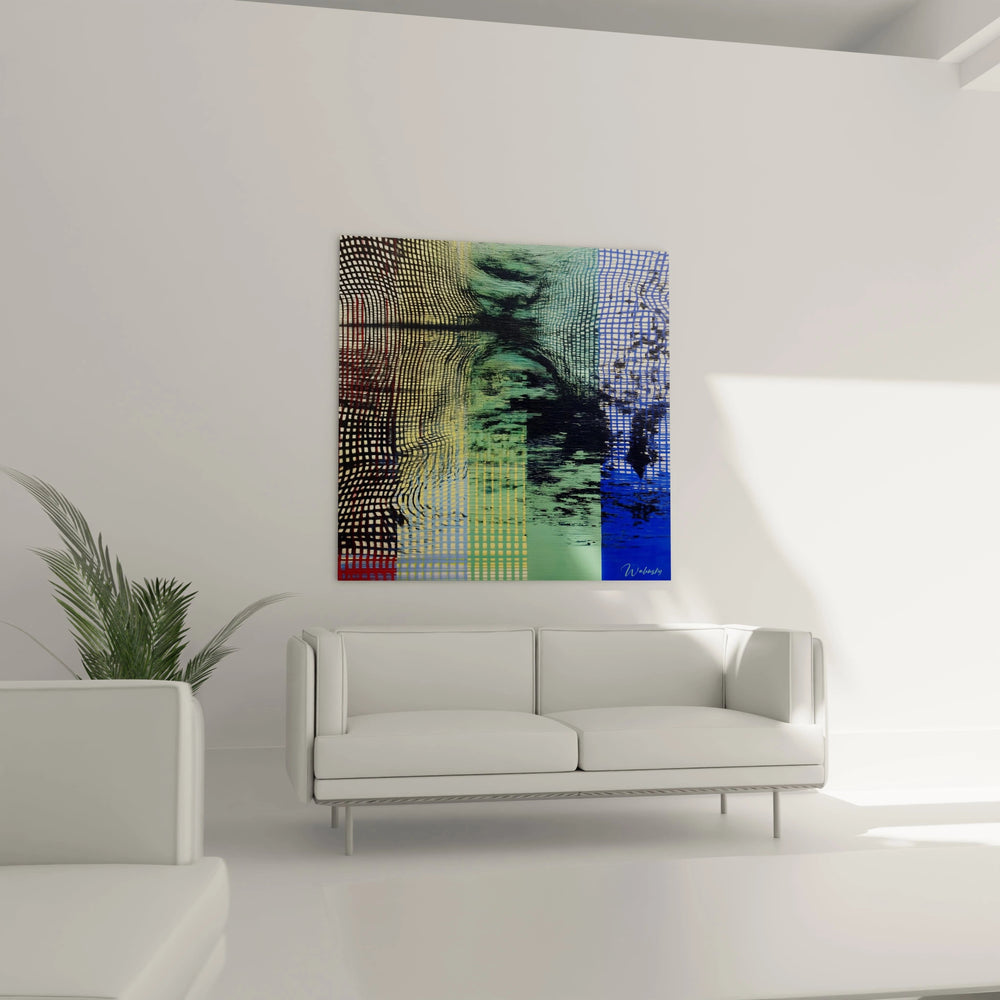 Cette œuvre d'art contemporaine révèle un tableau grilles aux propriétés visuelles exceptionnelles, créant des effets d'optique saisissants à travers des motifs géométriques ondulants. L'artiste développe ici un univers chromatique complexe où se mélangent harmonieusement les tons jaunes, verts émeraude et bleus profonds. Cette décoration murale grilles ondulantes génère des illusions de mouvement perpétuel, caractéristique des œuvres d'art optique. Les structures répétitives créent des zones de convergence visuelle particulièrement dynamiques, offrant une expérience contemplative unique.