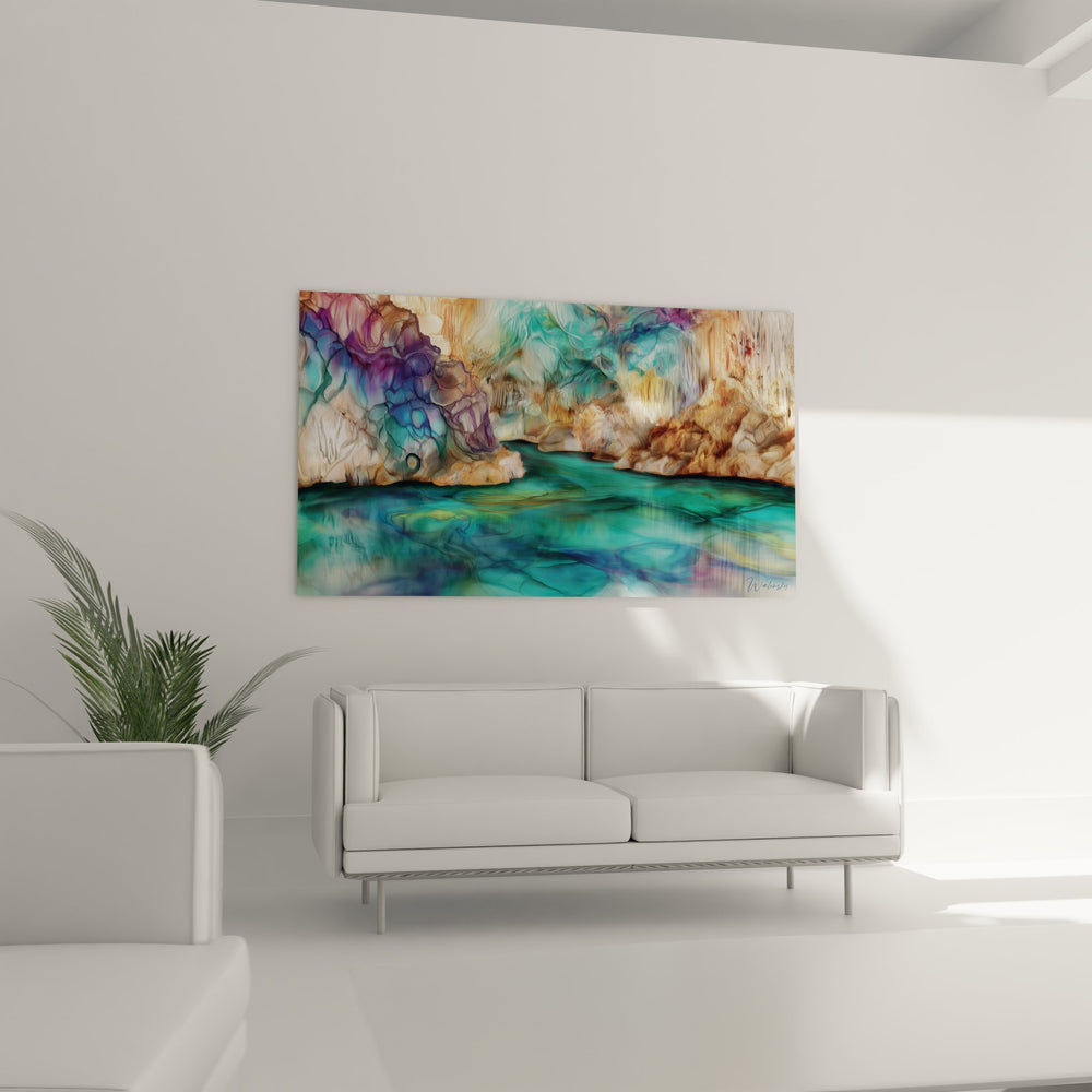 Ce tableau mural grotte naturelle présente une vision féerique d'une grotte aquatique aux formations cristallines exceptionnelles. L'œuvre révèle un paysage souterrain où les cristaux émeraude se mêlent harmonieusement aux tons violets et turquoise, créant une atmosphère mystique et apaisante. Les formations rocheuses se dressent majestueusement au-dessus d'un bassin aux eaux translucides, reflétant les nuances chatoyantes des minéraux environnants. Cette décoration murale grotte capture la beauté brute de la nature souterraine avec une approche artistique moderne. Les textures fluides et les dégradés de couleurs évoquent la lente formation géologique de ces merveilles naturelles. L'artiste a su retranscrire la magie des grottes naturelles en utilisant des techniques picturales qui subliment les jeux de lumière et les reflets aquatiques. Ce tableau moderne grotte transforme votre espace de vie en invitant à la contemplation et à l'évasion vers des mondes souterrains enchanteurs. Les détails minutieux des concrétions calcaires et des stalactites colorées témoignent d'un travail artistique raffiné qui célèbre la beauté géologique de notre planète.