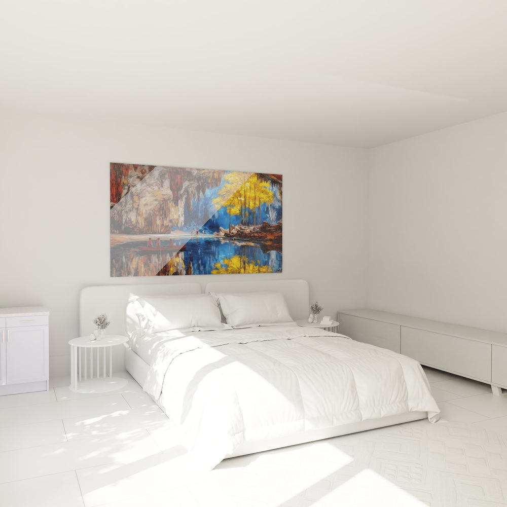 La palette chromatique de ce tableau grotte naturelle s'articule autour du contraste saisissant entre les bleus turquoise profonds de l'eau et les tons chauds dorés de la végétation. Les nuances ocre et grises des parois rocheuses évoquent l'ancienneté géologique, tandis que le rouge vif de la barque symbolise la présence humaine dans cet environnement sacré. Cette harmonie colorée reflète l'équilibre entre les éléments naturels et l'intervention humaine respectueuse de ces sites mystiques.