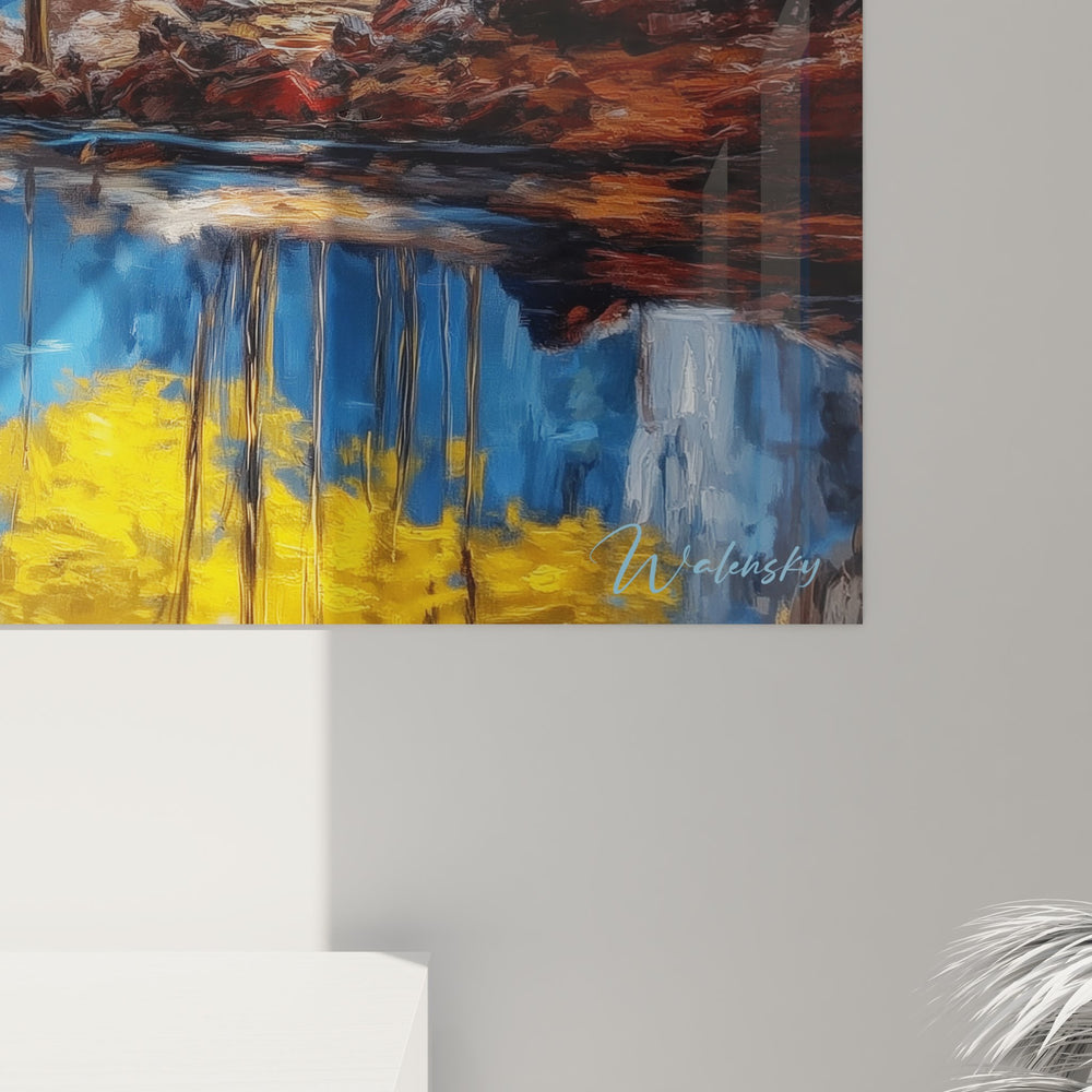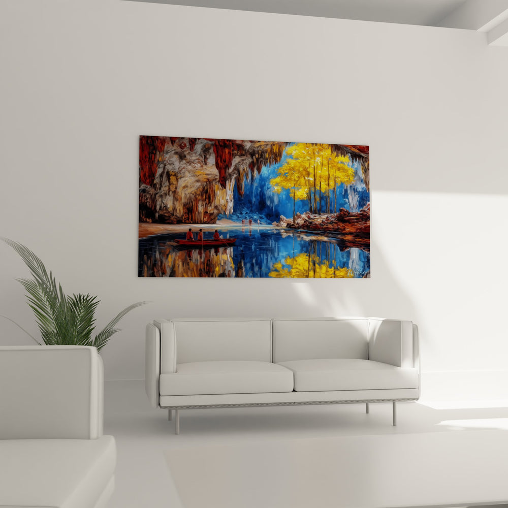 Ce tableau mural grotte cenote offre une vision saisissante d'une caverne naturelle aux dimensions spectaculaires. L'œuvre dépeint un cenote mexicain où les eaux turquoise reflètent parfaitement la voûte rocheuse et la végétation luxuriante. Au centre de cette composition, une barque rouge traditionnelle transporte trois personnages silencieux, créant un point focal dramatique sur les eaux cristallines. Les formations rocheuses calcaires s'élèvent majestueusement, sculptées par des millénaires d'érosion, formant des draperies minérales aux teintes ocre et grises. La lumière naturelle filtre par l'ouverture de la grotte, illuminant un arbre aux feuillages dorés qui contraste magnifiquement avec l'azur profond du ciel visible. Cette œuvre d'art grotte souterraine capture l'essence mystique des cenotes sacrés, ces puits naturels vénérés par les civilisations mayas. Les reflets parfaits dans l'eau créent un effet miroir saisissant, doublant visuellement la richesse de ce paysage souterrain. Ce tableau décoratif cenote transforme tout espace en une fenêtre vers ces merveilles géologiques exceptionnelles, invitant à la contemplation et au voyage imaginaire.