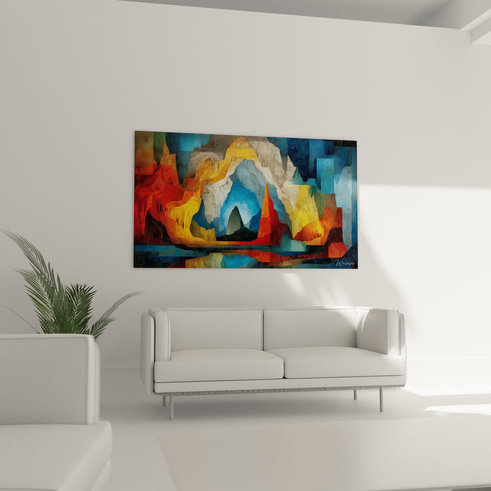 Ce tableau mural grotte présente une vision artistique saisissante d'une caverne souterraine illuminée aux teintes flamboyantes. L'œuvre dévoile un paysage karstique fantasmagorique où les formations rocheuses se parent de couleurs chatoyantes allant du rouge incandescent au bleu azur profond. Au centre de la composition, une grotte naturelle s'ouvre comme une cathédrale minérale, révélant ses voûtes majestueuses sculptées par le temps. Les stalactites et stalagmites sont représentées avec un réalisme saisissant, leurs formes calcaires blanches contrastant avec l'embrasement coloré de l'ensemble. Cette peinture de caverne joue magistralement avec les effets de lumière et d'ombre, créant une atmosphère mystérieuse et envoûtante. Les reflets dans l'eau souterraine ajoutent une dimension poétique à cette représentation artistique de grotte. Chaque détail géologique est minutieusement rendu, des concrétions calcaires aux draperies de calcite, offrant une immersion totale dans cet univers spéléologique fantasmé. Ce tableau décoratif grotte transformera instantanément votre espace en galerie d'art contemporain, apportant couleur et caractère à votre décoration murale.