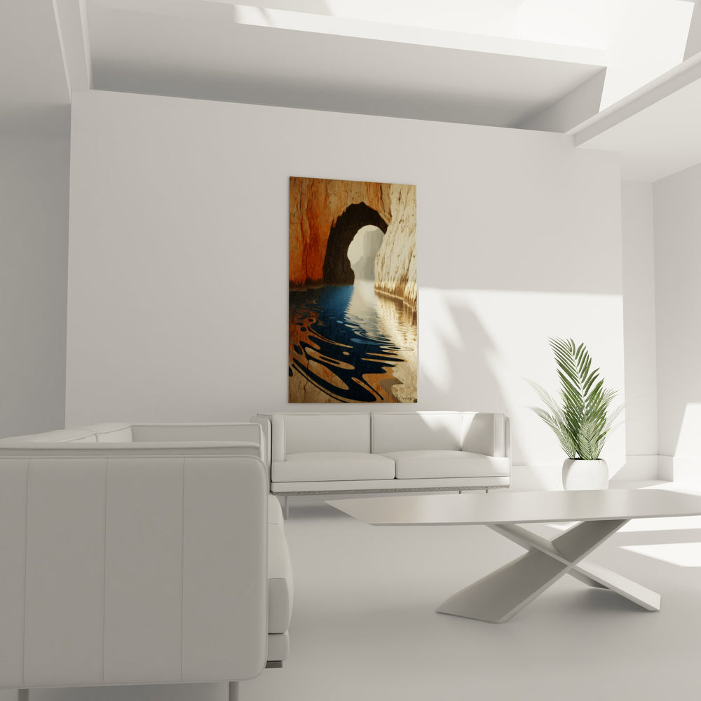 Ce tableau mural grotte marine capture la majesté d'une caverne naturelle illuminée par une lumière douce et mystérieuse. L'œuvre révèle l'entrée d'une grotte avec eau cristalline qui reflète les parois rocheuses dans des tons chauds et apaisants. La composition présente un paysage souterrain spectaculaire où l'eau d'un bleu profond contraste harmonieusement avec les formations calcaires aux nuances ocre et beige. La technique artistique employée met en valeur les reflets dorés sur l'eau de grotte, créant une atmosphère contemplative et sereine. Les textures rocheuses détaillées révèlent la complexité géologique de ces formations millénaires, tandis que la lumière naturelle filtrée crée des jeux d'ombres et de clarté saisissants. Cette représentation artistique de grotte naturelle invite à l'évasion et à la méditation, transformant tout espace en sanctuaire de tranquillité. L'artiste a su capter l'essence même de ces cathédrales souterraines, véritables merveilles sculptées par le temps et les éléments.