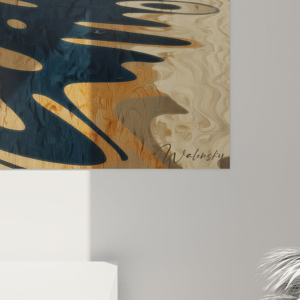 La palette chromatique terre et mer de cette œuvre évoque l'harmonie entre les éléments naturels. Les tons ocre et beige symbolisent la stabilité et l'ancrage, tandis que les bleus profonds représentent la sérénité et la profondeur spirituelle. Cette composition artistique équilibrée crée une atmosphère méditative propice à l'introspection et au ressourcement.