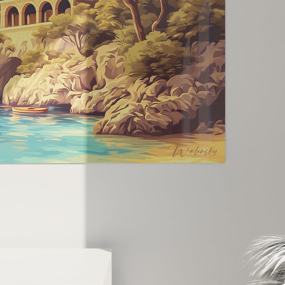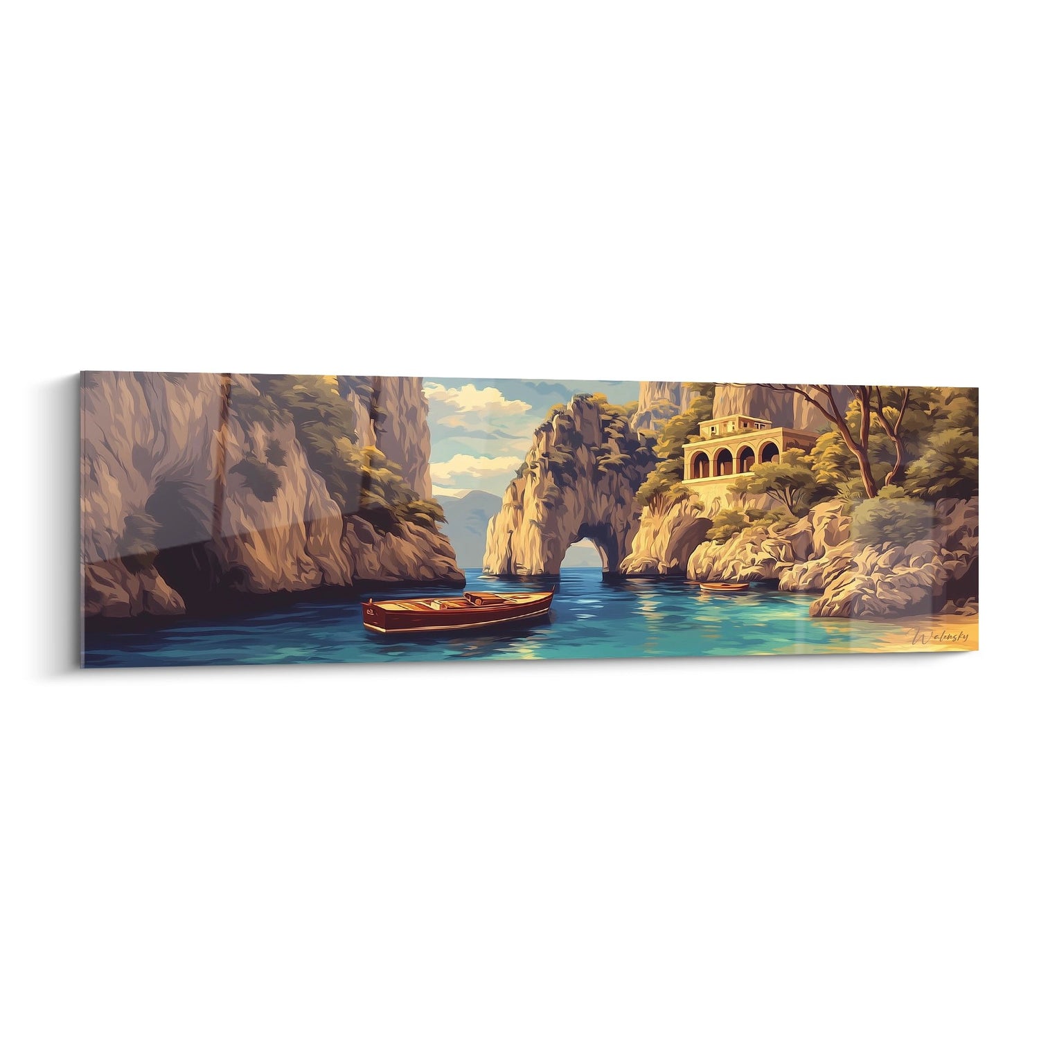 Ce tableau mural grotte marine présente une scène maritime enchantée où un élégant bateau en bois navigue dans les eaux cristallines d'une crique secrète. L'œuvre dépeint avec finesse les falaises calcaires dorées qui s'élèvent majestueusement de part et d'autre de cette grotte naturelle ouverte. Au premier plan, l'embarcation traditionnelle aux tons chauds de bois verni reflète parfaitement l'atmosphère méditerranéenne de cette crique isolée aux eaux turquoise. Les formations rocheuses sculptées par le temps révèlent des grottes marines spectaculaires aux voûtes naturelles, créant un passage mystérieux vers l'horizon azuré. La végétation luxuriante couronne les sommets rocheux, tandis qu'une architecture vernaculaire se devine, nichée harmonieusement dans ce paysage côtier de grottes calcaires. Cette représentation artistique de formation géologique marine capture l'essence des plus belles criques secrètes où se mêlent l'histoire géologique et l'activité humaine séculaire. Le tableau panoramique grotte naturelle évoque ces lieux magiques où les navigateurs trouvent refuge dans des cavernes marines aux reflets émeraude, véritables sanctuaires façonnés par des millénaires d'érosion marine.