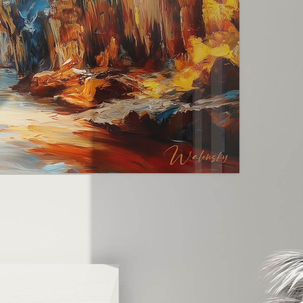 Ce tableau mural grotte souterraine capture avec une intensité saisissante l'atmosphère mystérieuse d'une caverne naturelle ornée de stalactites dorées. L'œuvre dévoile un paysage souterrain où la lumière bleue naturelle perce à travers une ouverture rocheuse, créant un contraste dramatique avec les formations calcaires aux teintes chaudes. Les stalactites et stalagmites se dressent majestueusement dans cette cathédrale souterraine, leurs surfaces sculptées par des millénaires d'érosion. Au premier plan, un plan d'eau tranquille reflète parfaitement cette architecture naturelle, doublant la beauté de cette grotte aux reflets dorés. La technique picturale employée fait vibrer chaque détail : les aspérités de la roche, les jeux d'ombre et de lumière, et cette fascinante transition entre les tons ocres des formations calcaires et l'azur céleste qui s'immisce dans les profondeurs. Ce tableau art souterrain moderne transforme n'importe quel espace en invitation au voyage et à la contemplation. L'artiste a su capter cette magie particulière des grottes naturelles éclairées, ces sanctuaires géologiques où le temps semble suspendu.