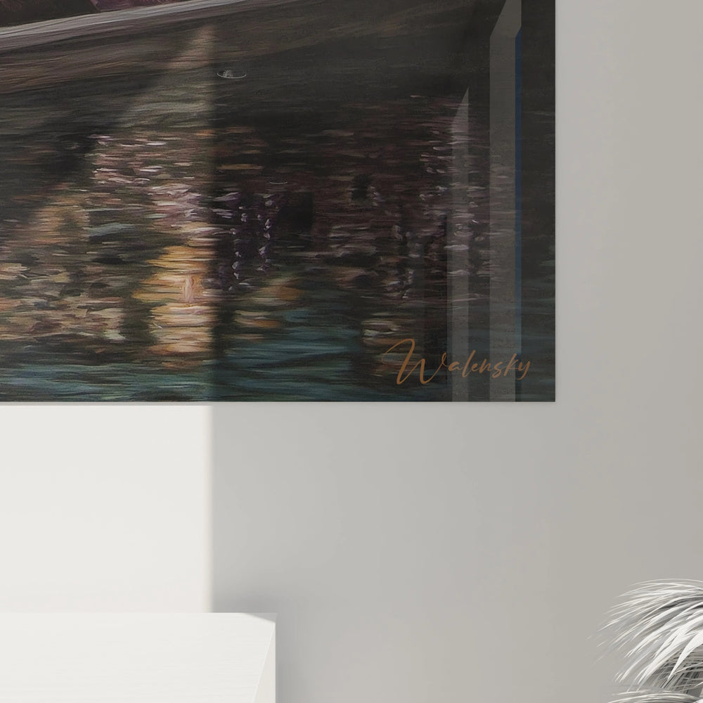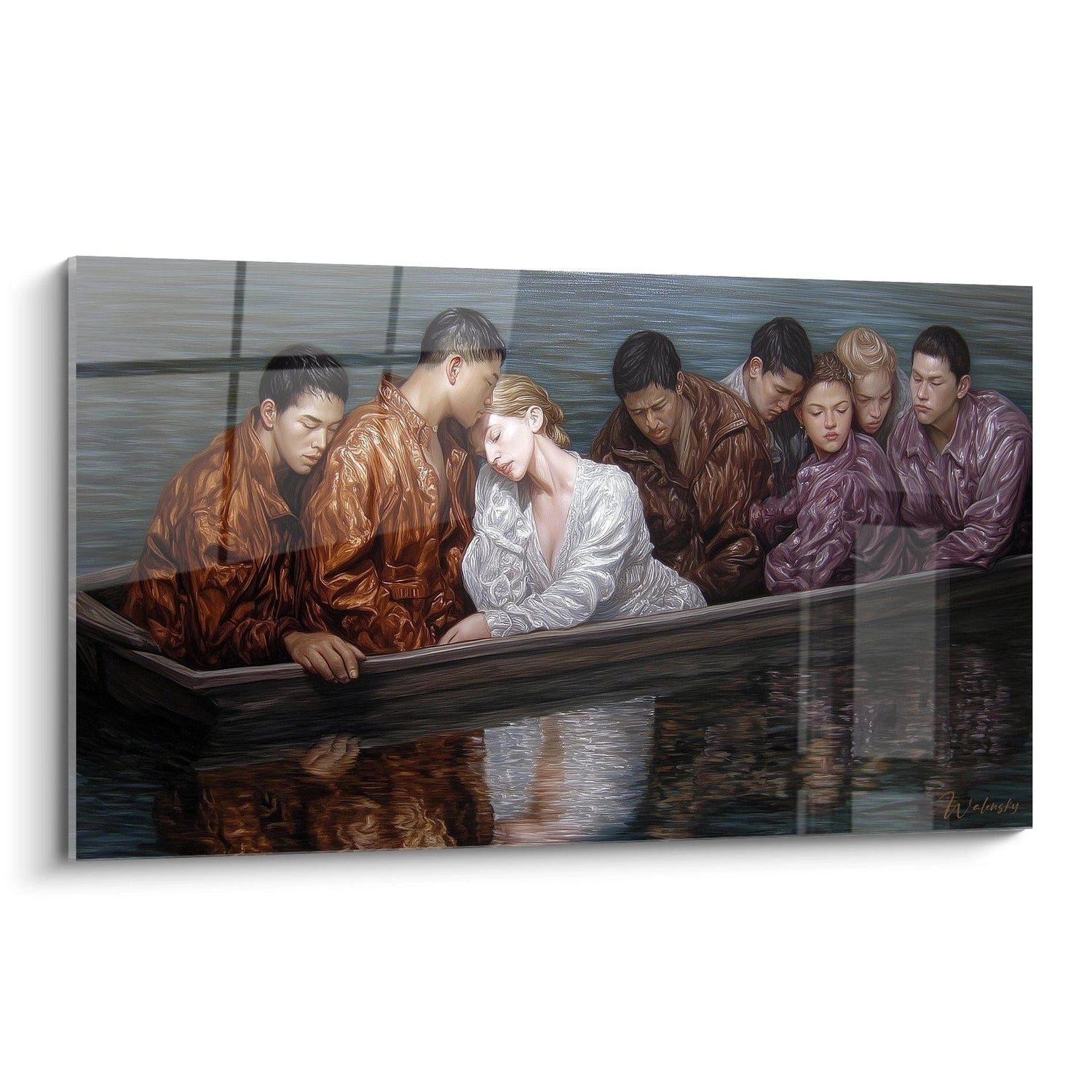 Cette œuvre d'art présente un tableau groupe d'une intensité visuelle remarquable, montrant plusieurs personnes rassemblées dans une embarcation sur des eaux calmes. La première impression révèle une composition hyperréaliste où chaque visage exprime une émotion distincte, créant une narration collective captivante. Ce tableau groupe contemplation se distingue par ses détails minutieux et sa capacité à saisir l'intimité d'un moment partagé. L'élément distinctif immédiatement visible réside dans le contraste saisissant entre les vêtements aux textures riches et la surface liquide qui les reflète. La précision technique transforme cette décoration murale groupe en une fenêtre sur un instant suspendu dans le temps.
