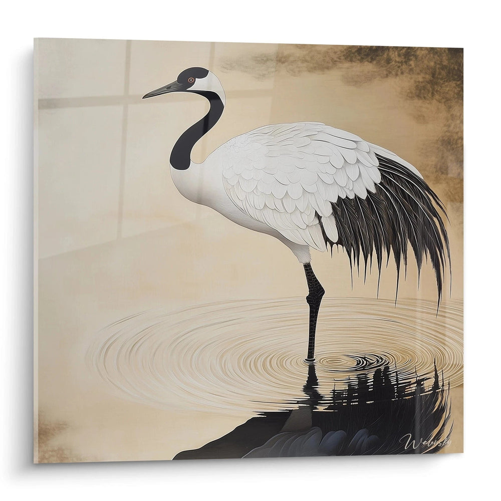 Ce tableau grue captive immédiatement par la représentation majestueuse d'un échassier au plumage gris et blanc, se tenant gracieusement au bord d'un plan d'eau. L'œuvre révèle une grue cendrée dans une posture contemplative, son long cou élégamment courbé et son bec effilé dirigé vers les eaux calmes. Le tableau grue dans l'eau met en scène cet oiseau emblématique sur une seule patte, position caractéristique qui évoque l'équilibre parfait entre force et délicatesse. L'arrière-plan se compose de tonalités dorées et beiges qui créent une atmosphère sereine et intemporelle, tandis que les reflets dans l'eau ajoutent une dimension poétique à cette décoration murale grue exceptionnelle.
